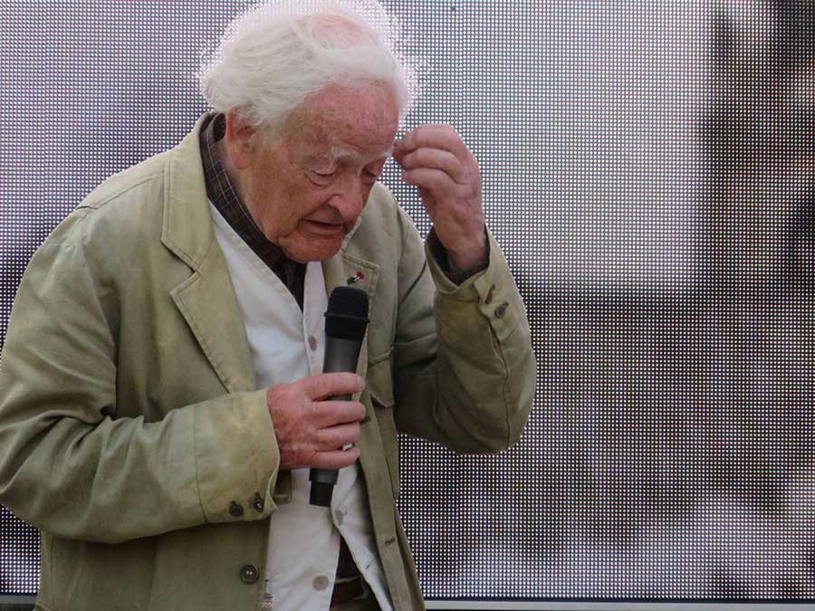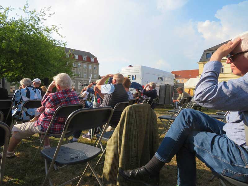 und auf dem Platz des ehem. Marktes mit anderen Menschen gegen die Sonne schauend.