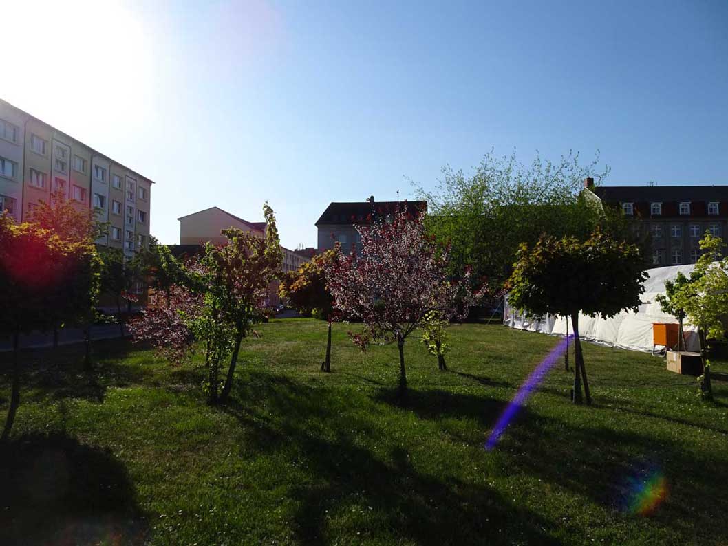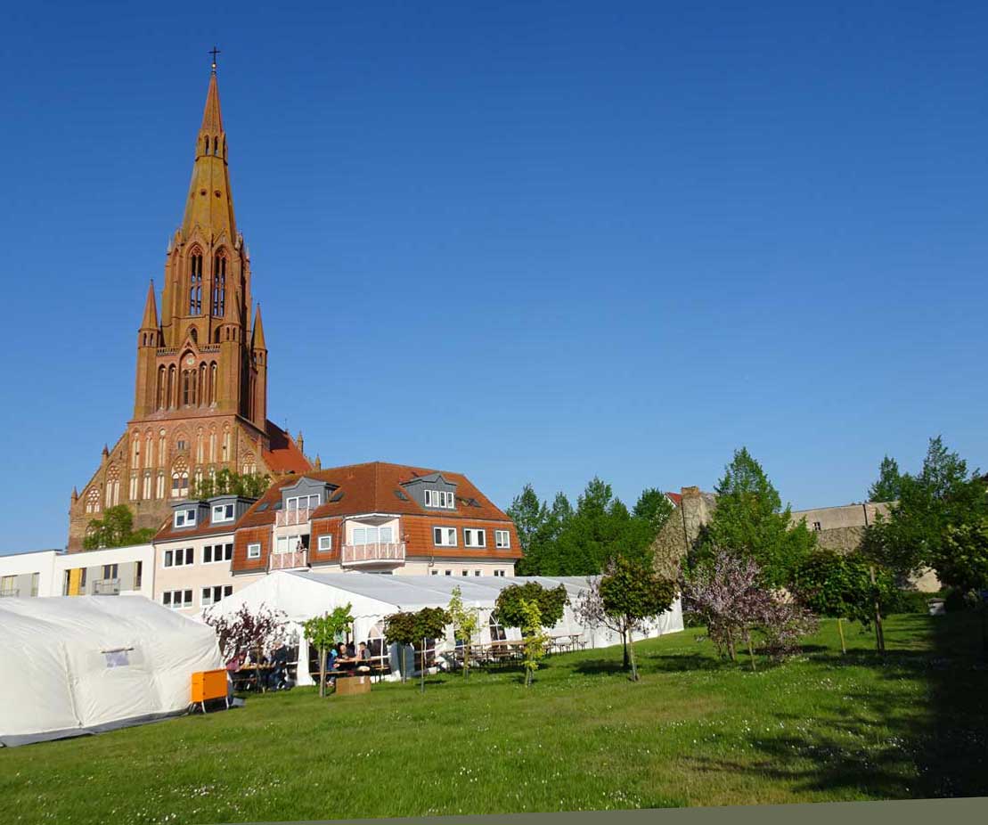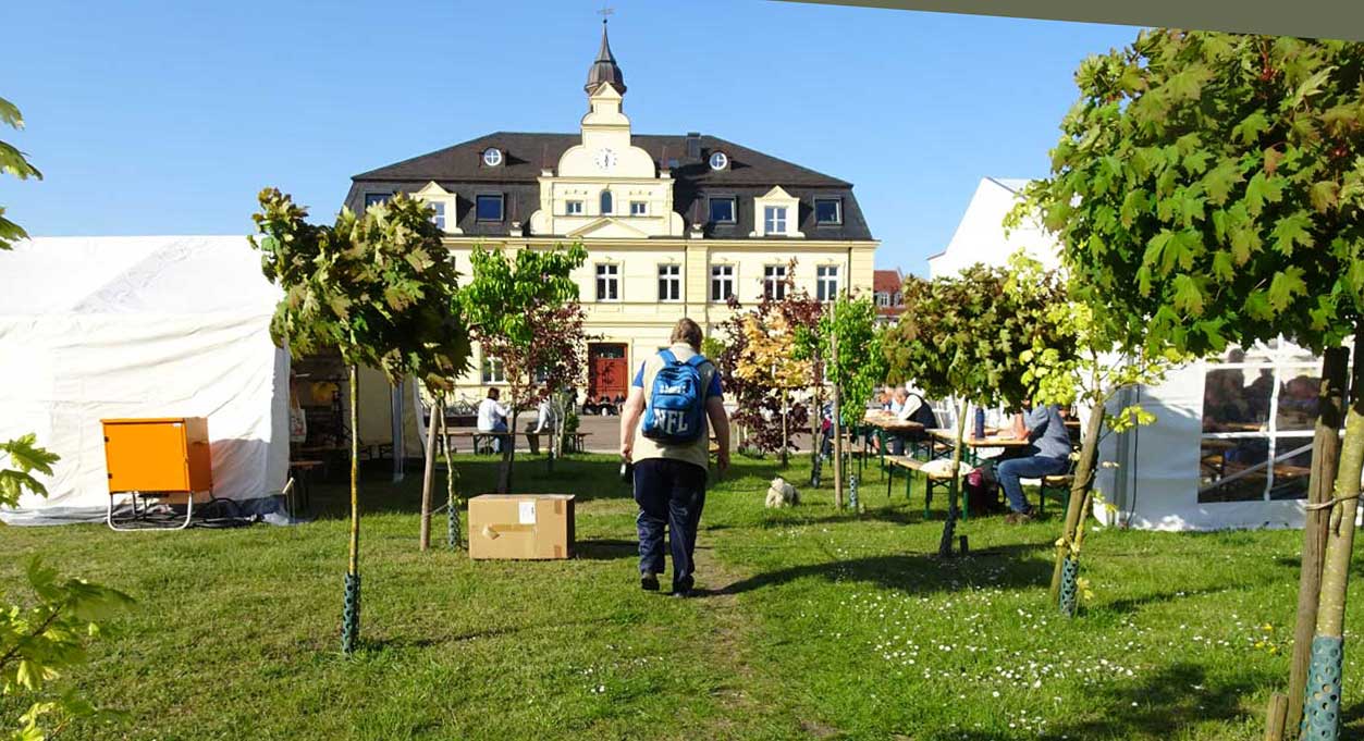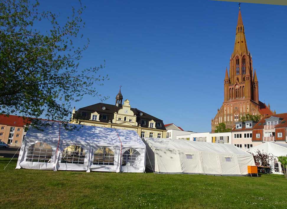aktuelle Nutzung des Marktes. Wo bis 45 die Häuser standen die das Zentrum der Hanse-Stadt waren, nun ohne Schiffe - für ein Posaunentreffen. Was werden sie blasen. Auf den Instrumenten, die einmal die des Himmes waren.