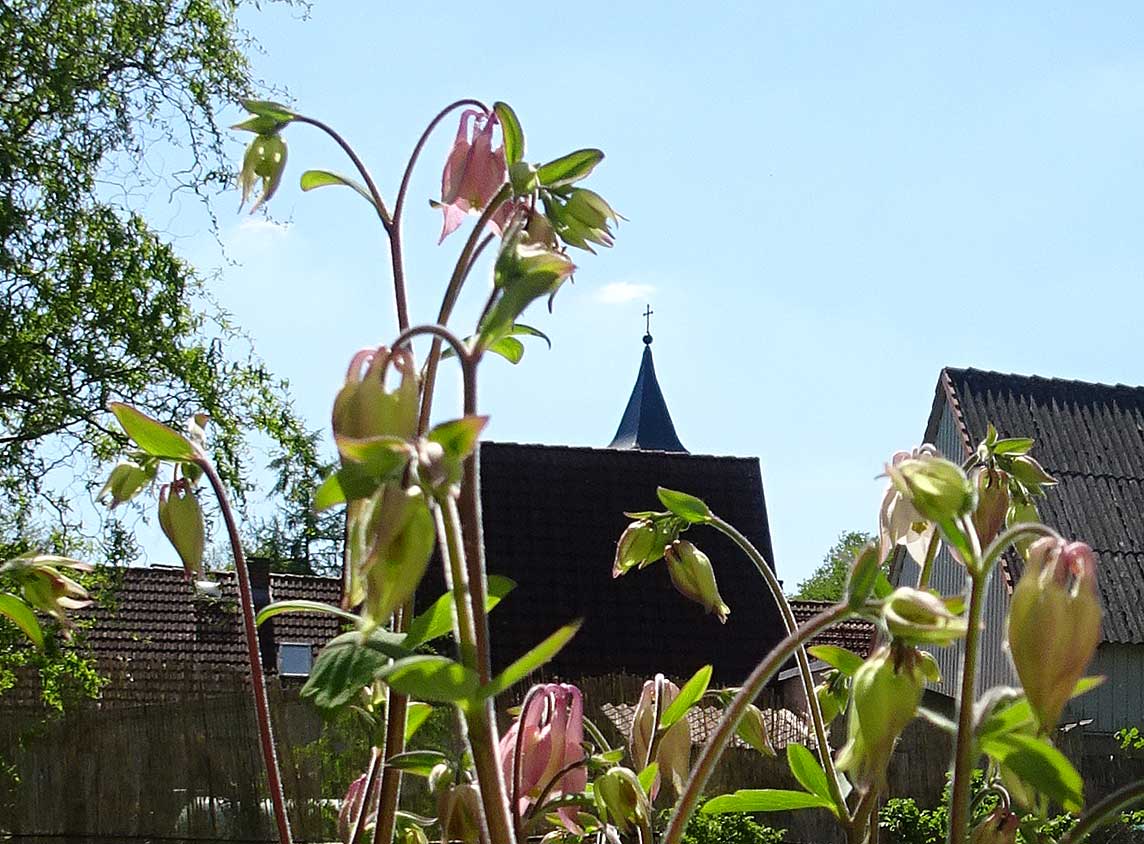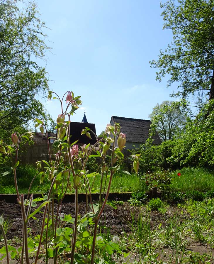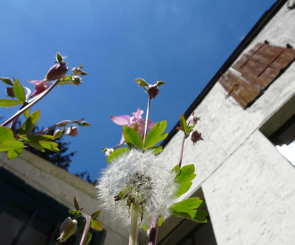 Auf der Dorf-Seite des Hauses türmt es sich hin zum Turm.