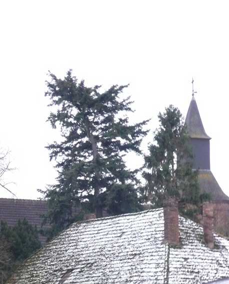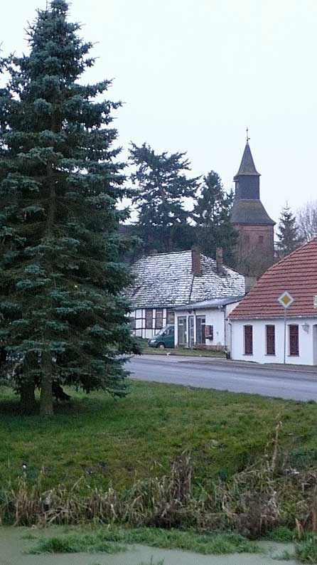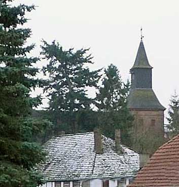 Noch zu retten. Die alte Schule in der nach 1945 die damals junge Marlies Voigt, aus Stettin später verh. Hamann aus N. unterrichtete und wo früher Horst Beerbaum zur Schule ging. Vor der Kirche die sich ineinader schiebenden Dächer.