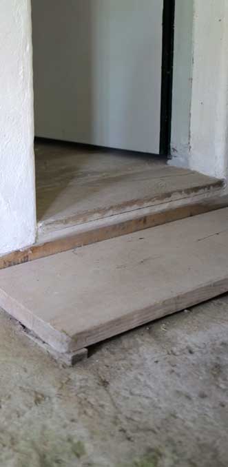 Stolperschwellen der hervorgetretenen Raumübergänge im festen Grüst des Gehäuses nun mit hoch-und herabführenden Schwellen.