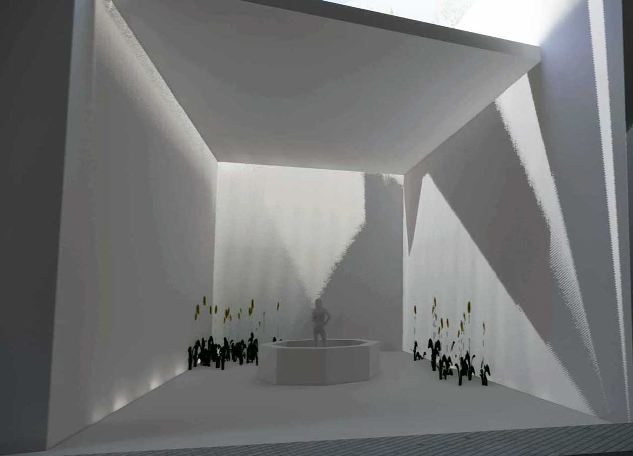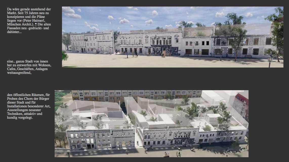 Wenn wir heute die Kapitel des Films in der Reihenfolge ihres Erscheinens im Film etwas verkürzt, nach Art der Trailer durchgehen, kommen wir jetzt an die Arbeiten von Peter Haimerl , dem Architekten aus München, der weiss, wie man an einem kleinen Ort und abseits ein kultuelles Zentrum schafft -wie Blaibach im fernen Bayerischen Wald, das seidem blüht-. Hier in Demmin, im Vergleich zu den kollegialen Modellen von A. Schwarz und seinen Studenten, ein kontrastierender Versuch. Aus dem ehemaligen Markt und seit 1945 unbebaut, ein neues Zentrum zu schaffen. Die jetzt alle Blicke und Raum-störende Plattenbaufassade würde zurückgedrängt.