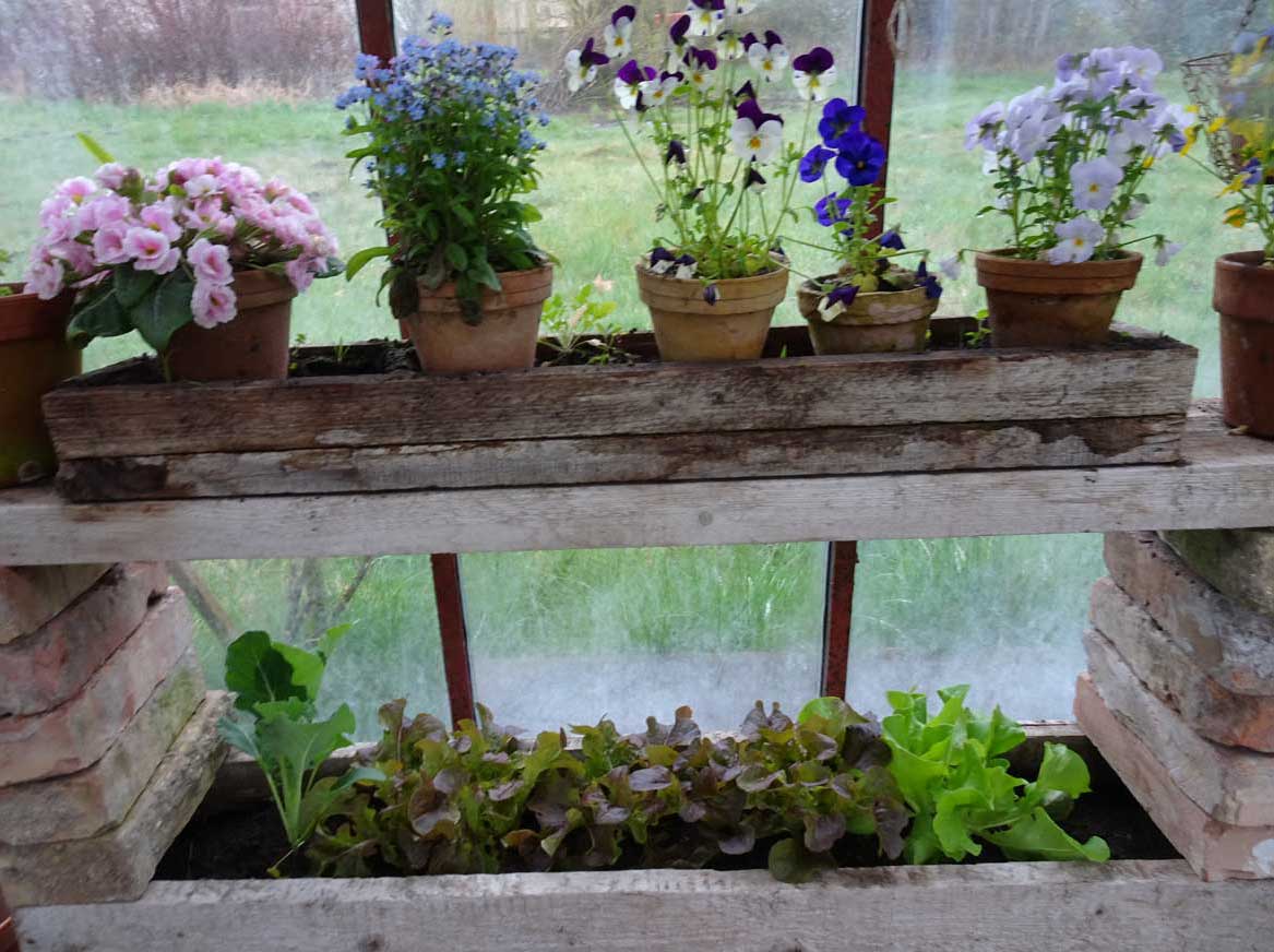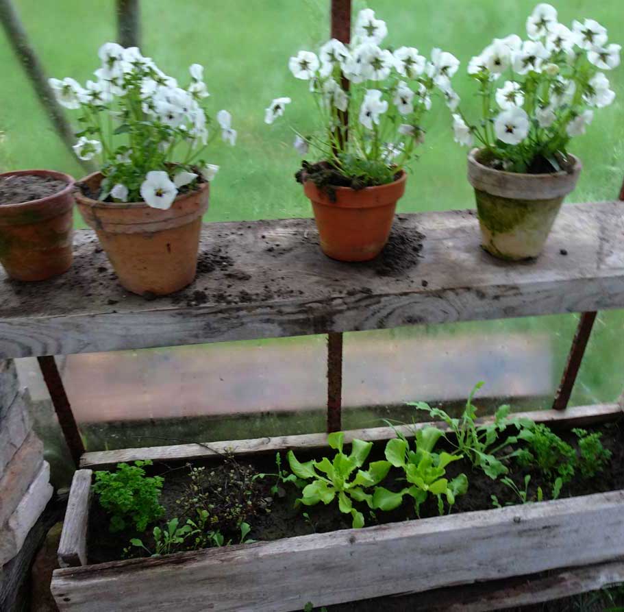 auch die Kapuzinerln werden bald blühen hier gut gehalten, gewärmt von innen, über den Winter gekommen, draussen noch nicht als Samen in der Erde.