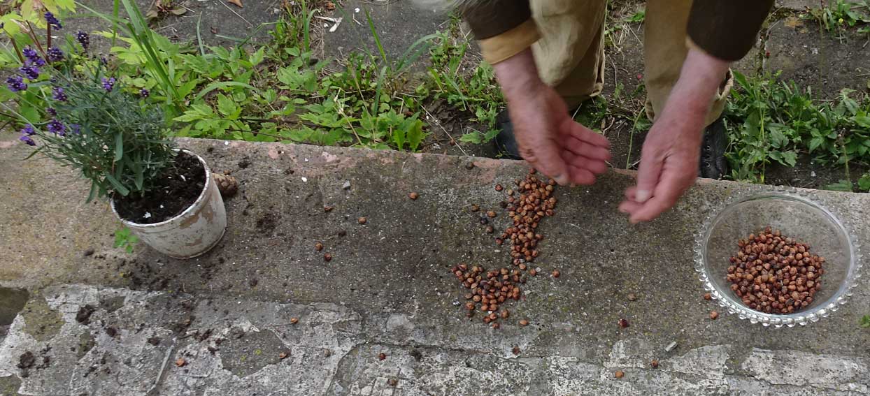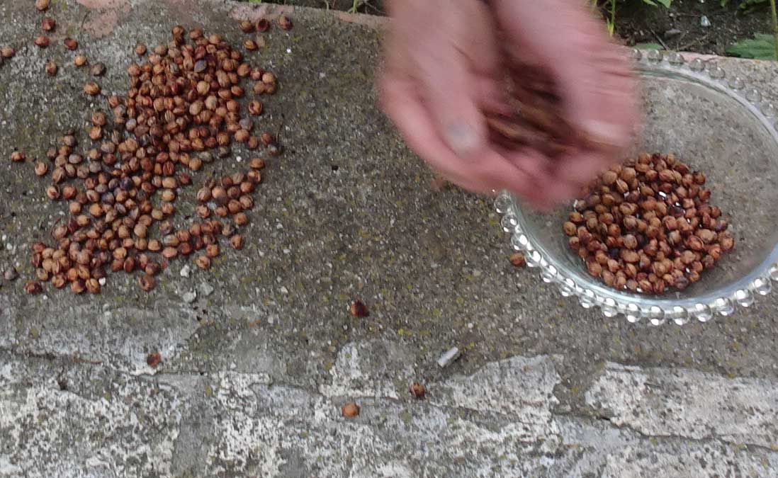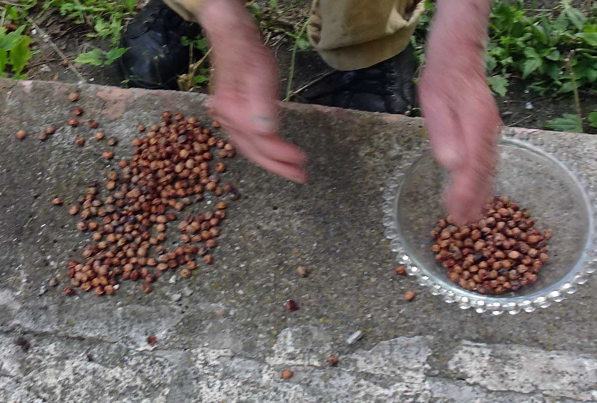 vor der feuten Nacht die zu trocknenden Kerne in den Schutz des Hauses tragen