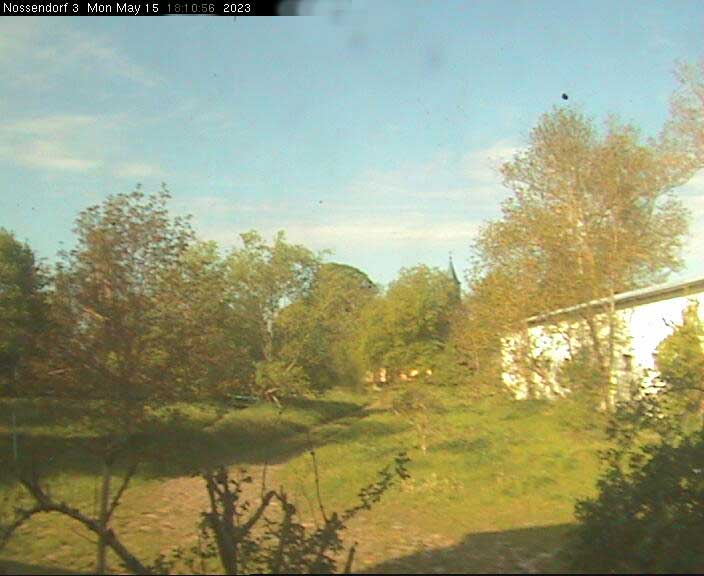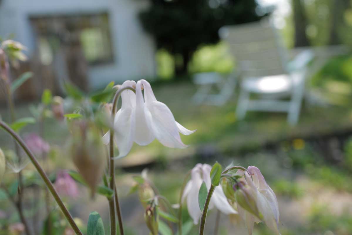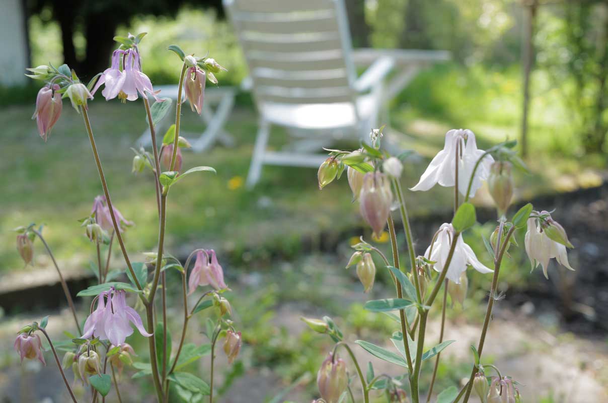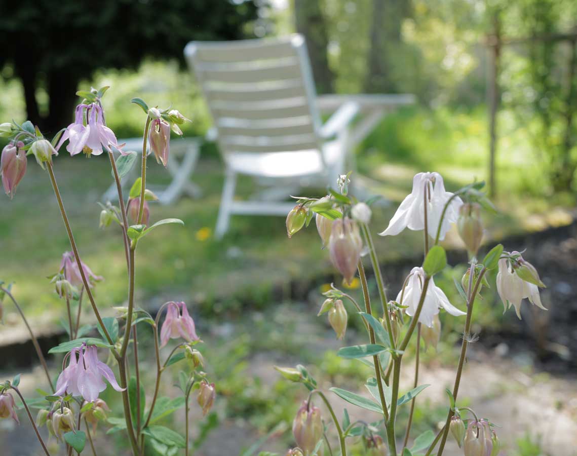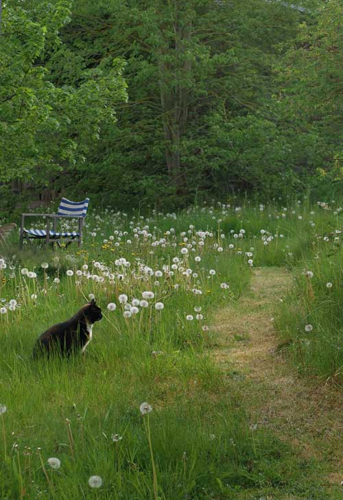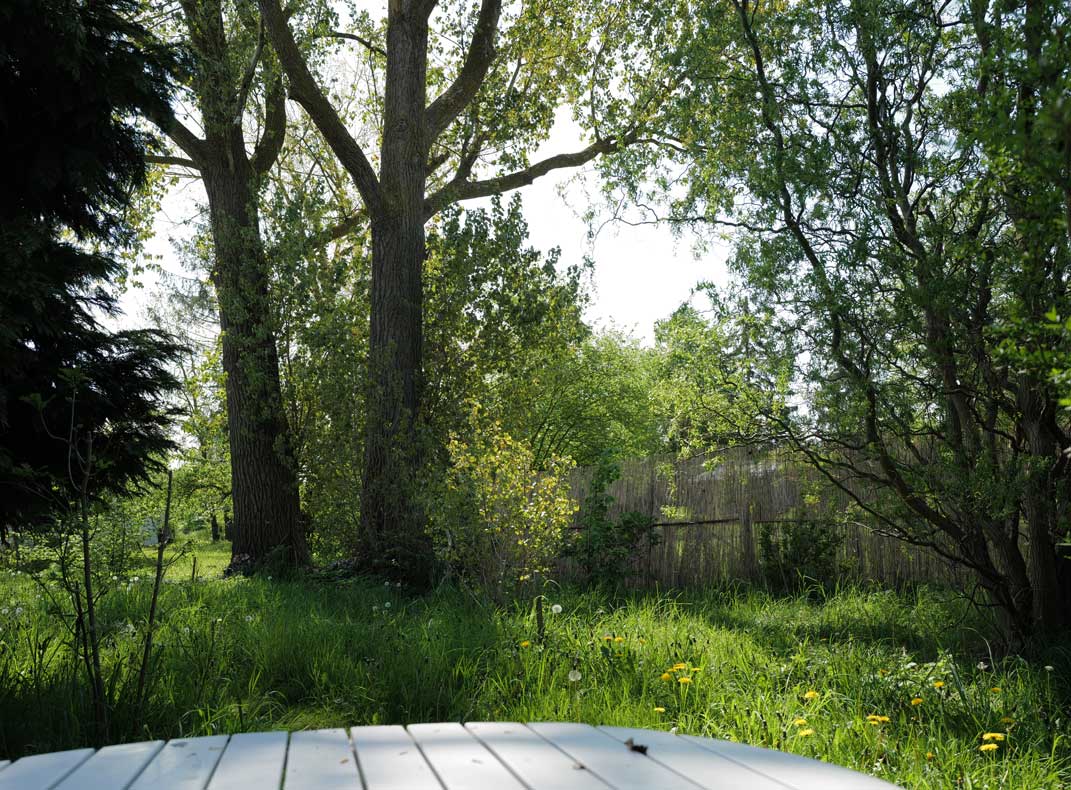 und nun mit dem Stuhl dahinter ganz zu sehen und etwas vom Dahlienbeet frisch eingesetzt, auch die kühlenden Bäume dahinter, aber die kommen gleich.