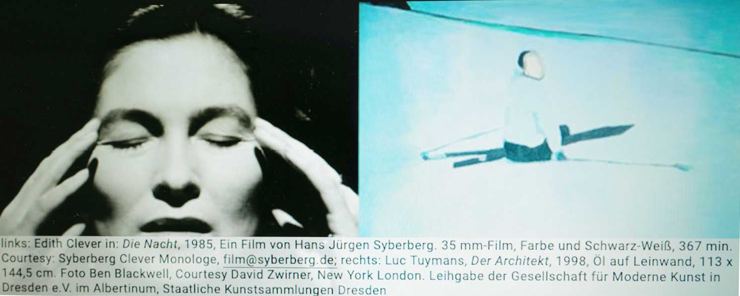 Für Mitte September, in 8 Wochen, hat die Akdemie der Künste in Berlin, eine Ausstellung angesagt, von L. Tuymans aus Antwerpen, als neuem Mitglied des Hauses durfte er sich ein Mitgleid aus dem Haus dazu einladen. Er wählte Edith Clever, empfohlen in Mailand, wo er den Hitlerfilm zu seiner Ausstellung ins PradaKunstzentrum uns geholt. Daraus entstand nun zu seinem Bildern ihr Auftritt mit der NACHT in eigener Version. das hiess Kürzungen für Ausstellungsbesucher, ineins, chronologisch, aber ohne Teile, die sie dafür nicht brauchen wollten hatte. Ich versprach - nur diesmal und nur ihr ein Ja- keine Einmischung. Mit Anmerkungen was fehlt, am Eingang auf Papier.