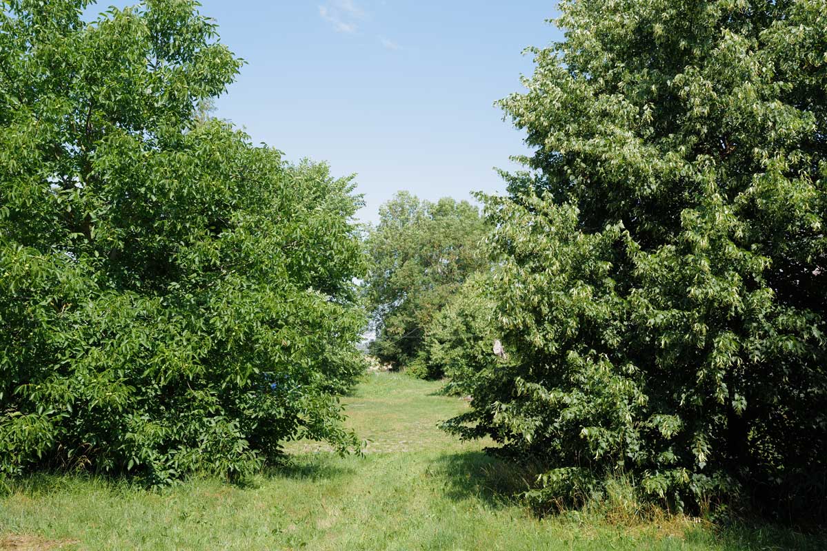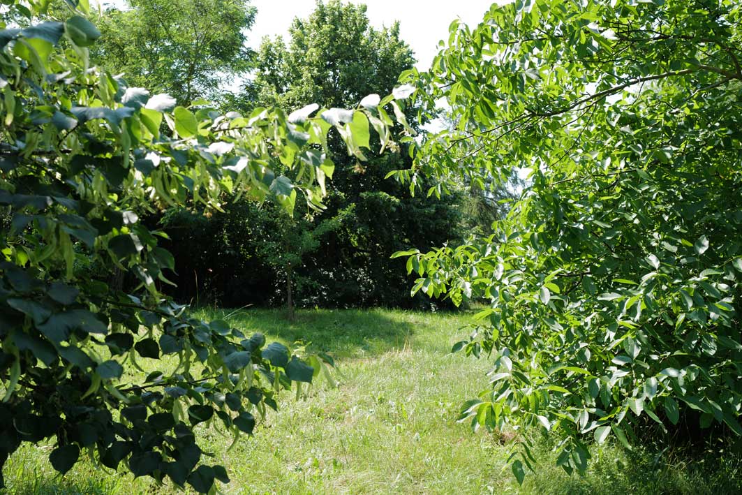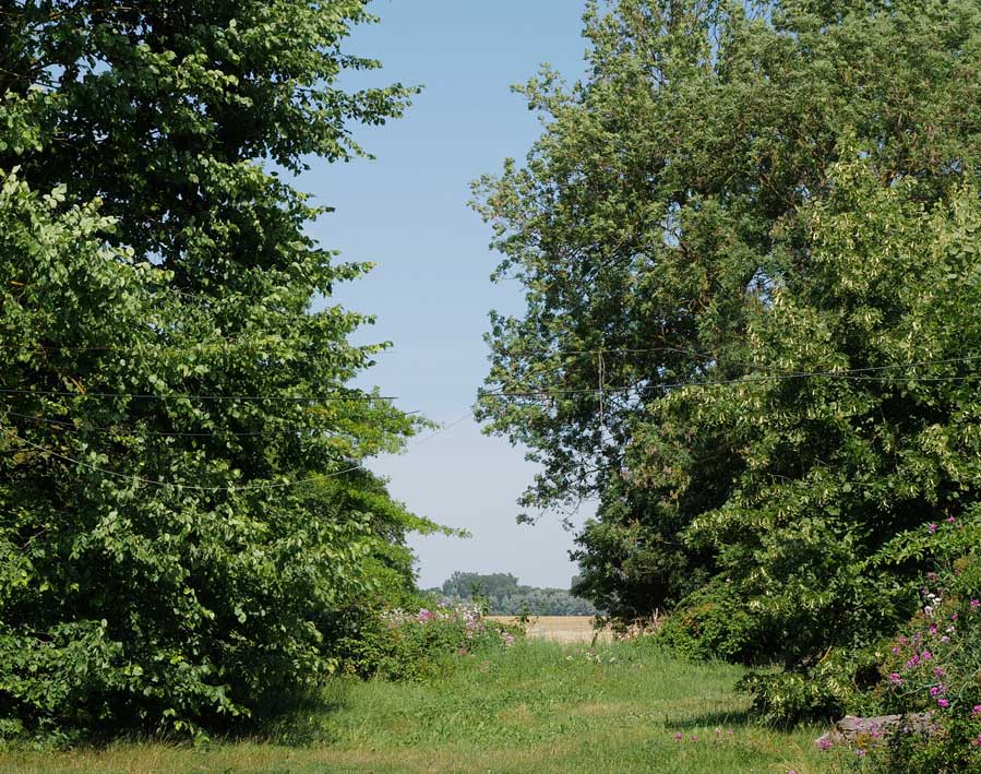 Linde links und Nussbaum rechts hinten die Ulme, das braucht keinen Park der hist. Epochen. Es ist einfach ein Hof, der zum Park wurde. Pferde weg. Keinen Schweine mehr, ohne Hühner, Gänse, Enten,Puten, keine Kühe mehr, die Scheune die zur LPG Halle wurde. Mach was draus - gemacht. Der Halbschatten-Weg oben über dem Hof.