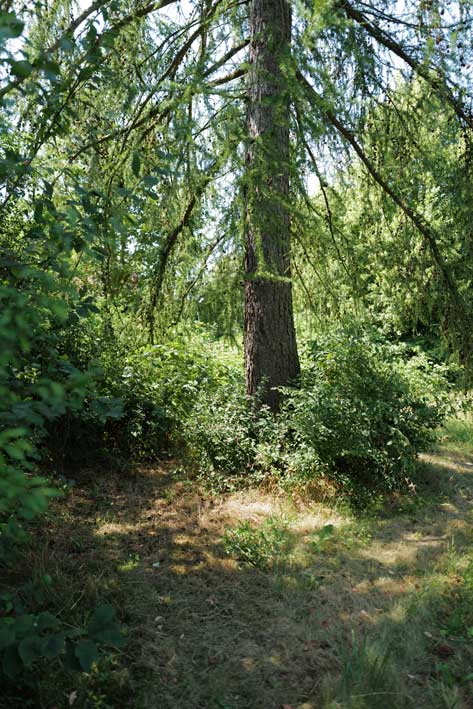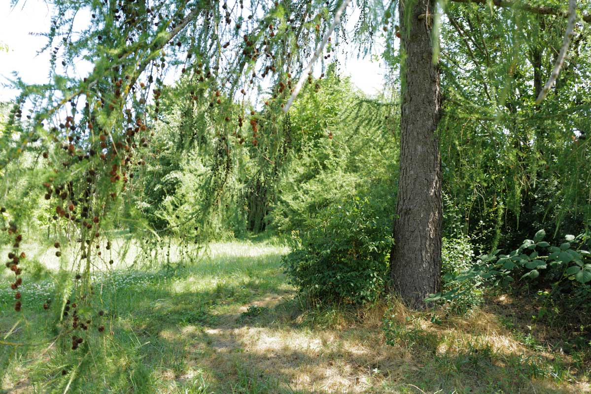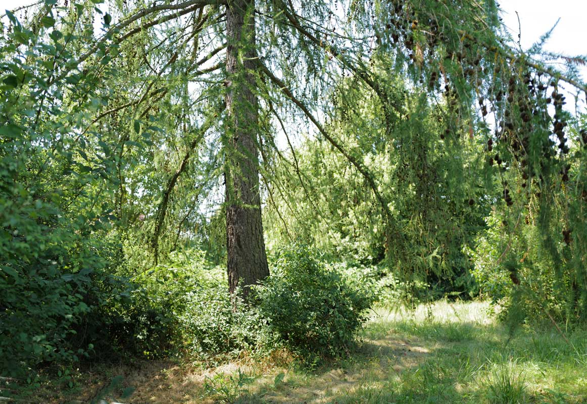 Wir freuen uns des Klees unter dem sanften Vorhang der Lärchen, Zweige tief herab, dürfen es, vor dem Haus dahinter schon zugewachsen nun.