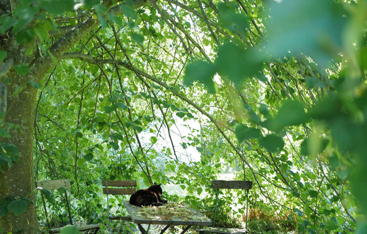Vorbei am Platz der Linden mit dem Tisch wo im Frühling die Knospen der Blätter ringsum täglich mehr aufgehen. Ein Schauspiel. Unverzichtbar.