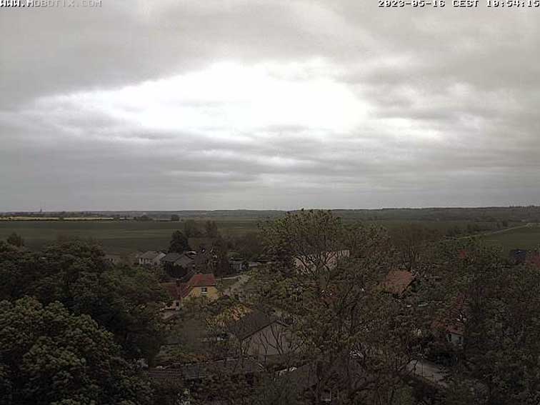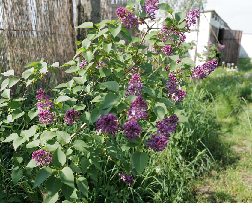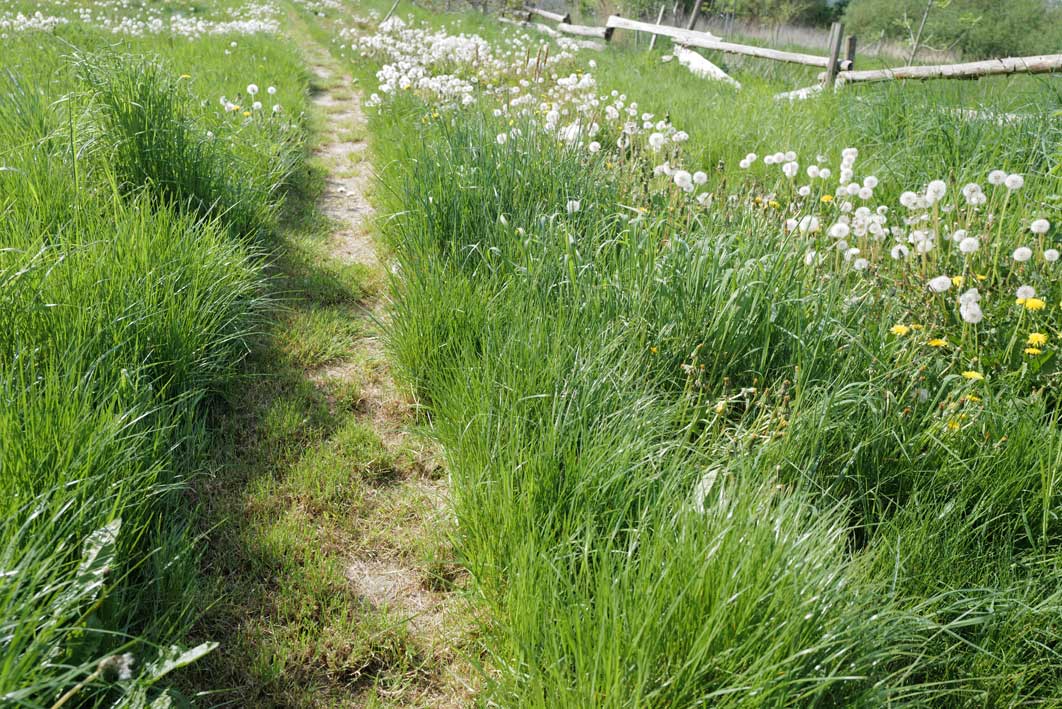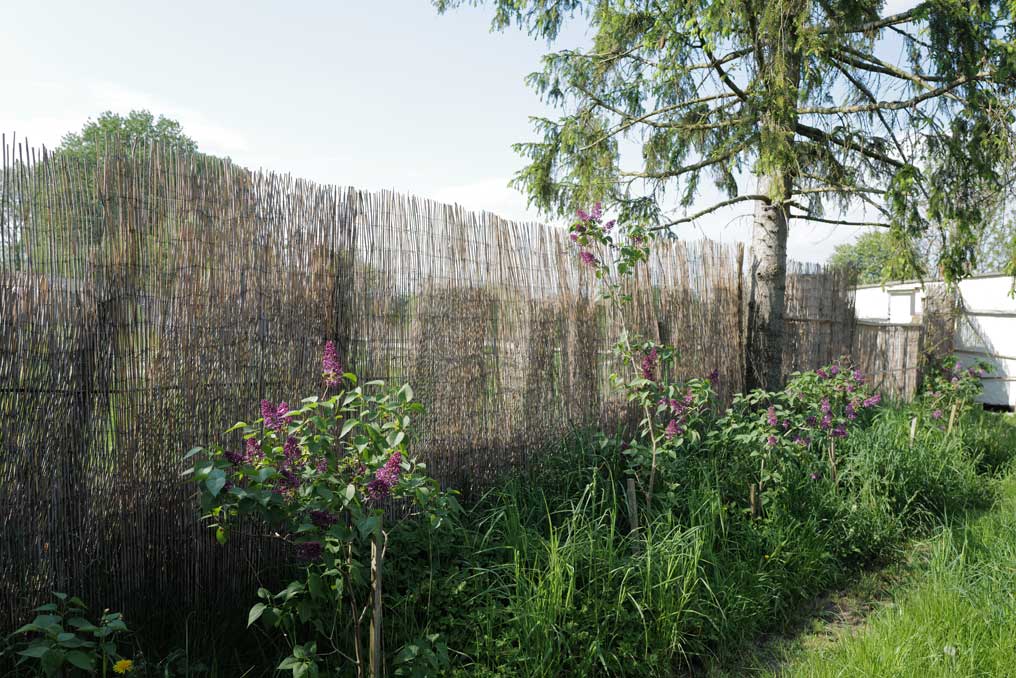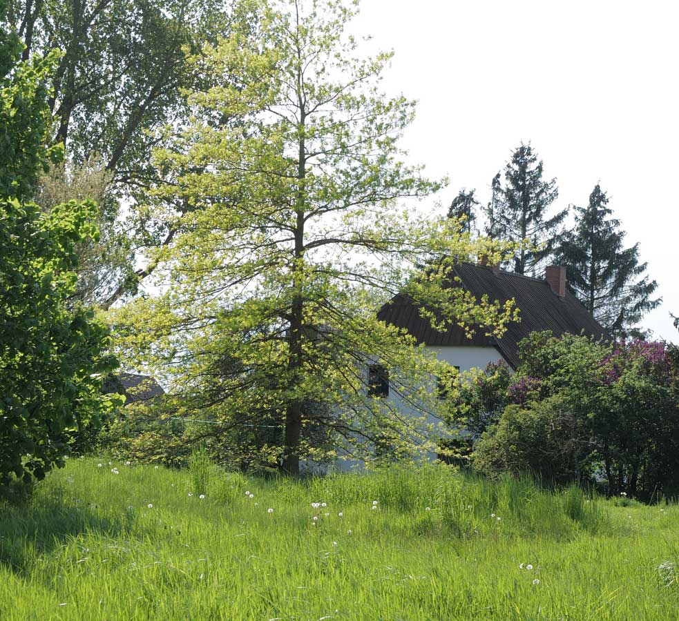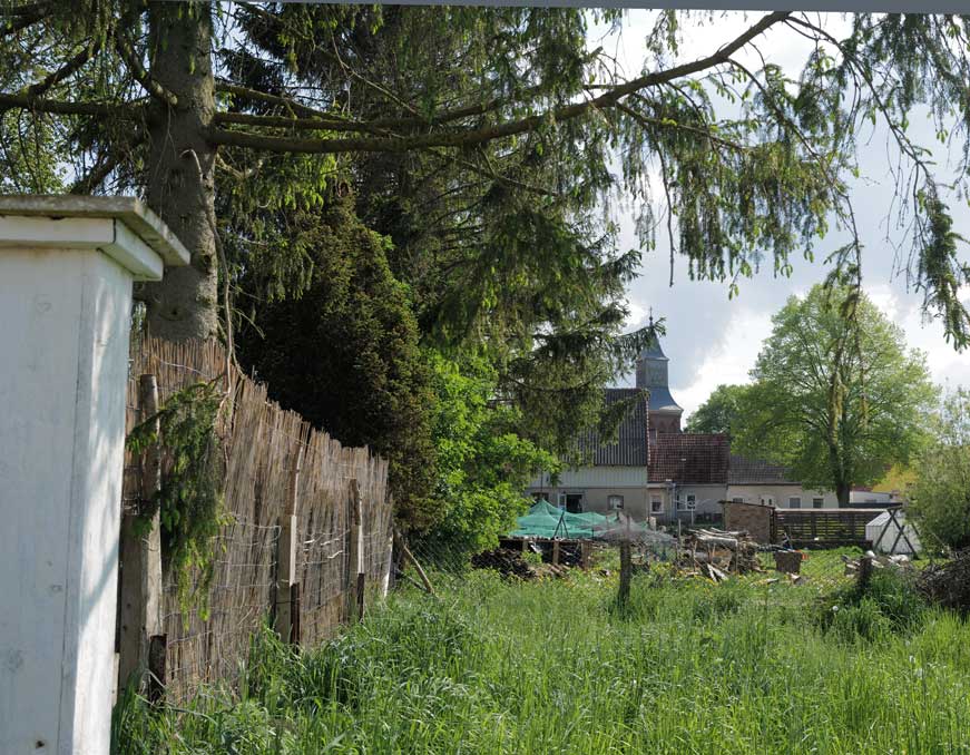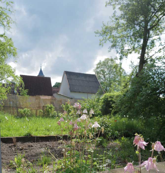 Der Blick über blühende Akelai ins Dorf der Dächer auf den Turm, die Dalien schon in der Erde.