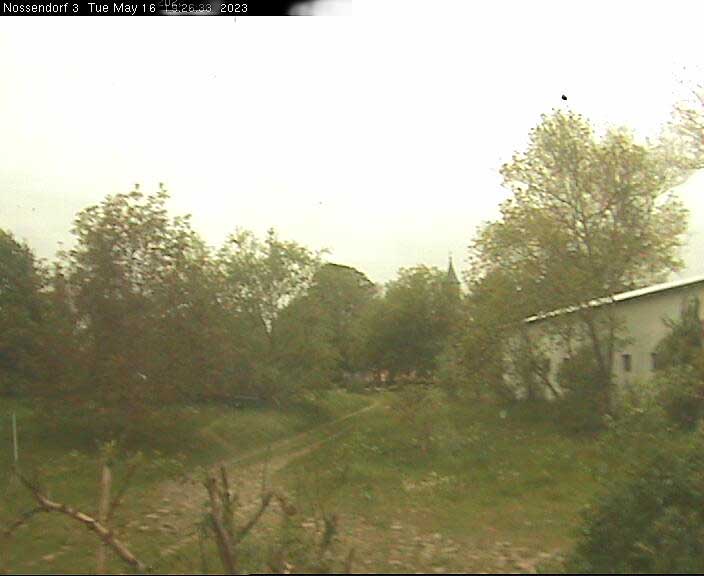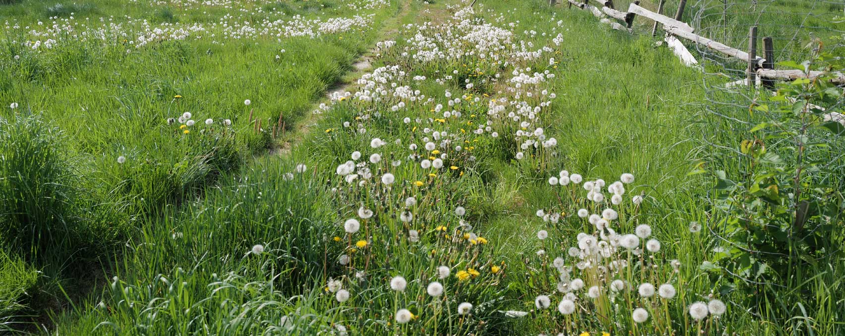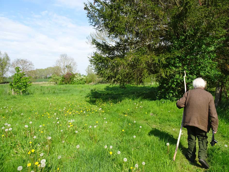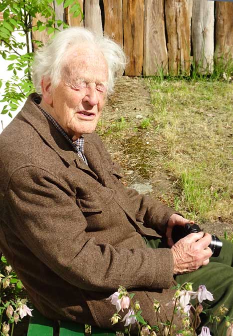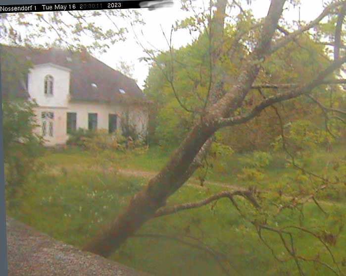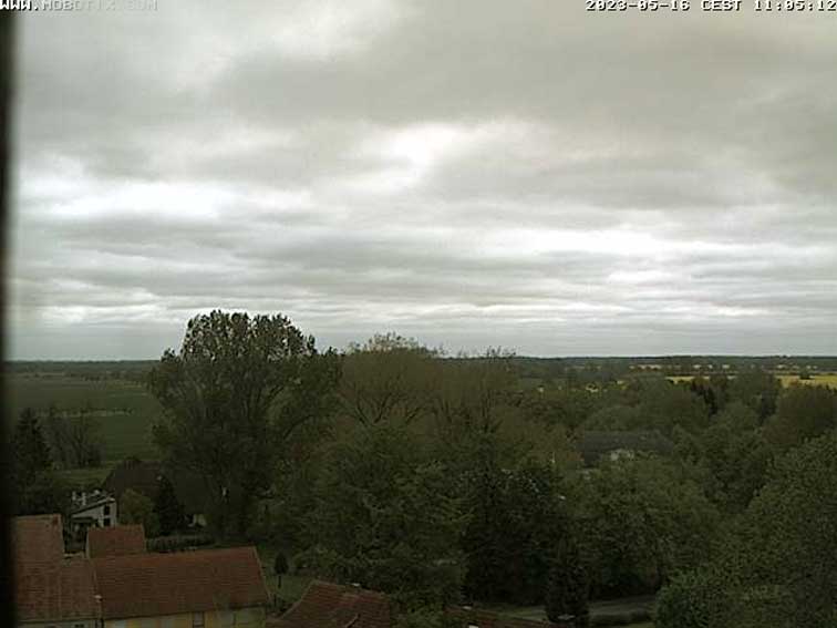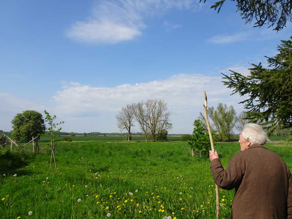 Der Blick über blühende Akelai ins Dorf der Dächer auf den Turm, die Dalien schon in der Erde.