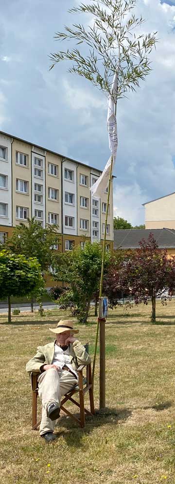 nun also die VB Berlin. Die Banner links und rechts herab an der Fassade gehen nicht. Vor dem Haus die Installatiom Demminer Gesänge mit der NACHT zusammen will auch die Stadt nicht, grüner Rasen.