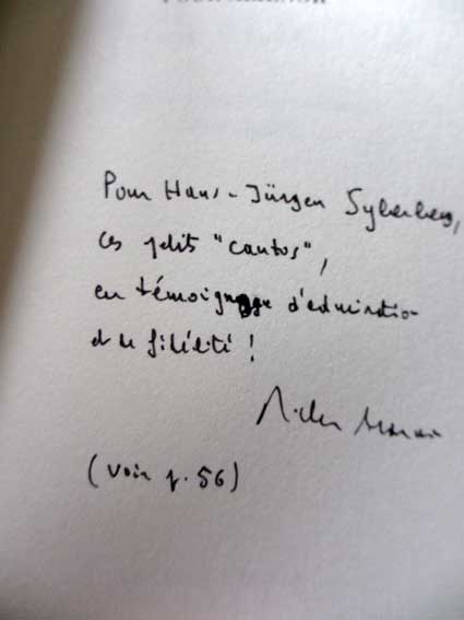 I must apologize for my horrible handwriting. I simply wanted to say that I sent you these poems as a testimony of admiration and loyalty. The last line on page 56 is a cryptic tribute to your Ludwig and your « royal » art !Yours