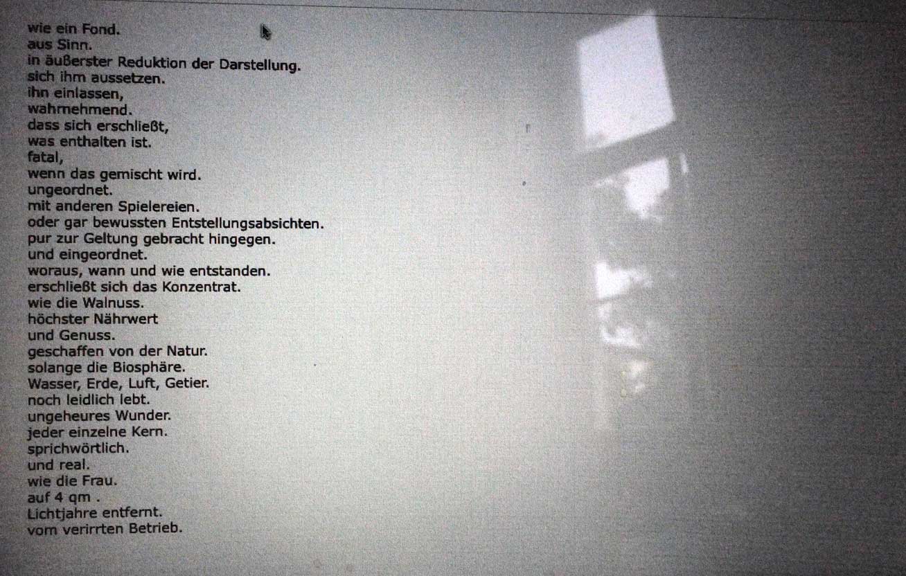 Was wir vor 40 Jahren mit der Nacht versuchten, war nicht nur für Theater und Film anders in der Herstellung und im Sinn dessen, um was ging. Das waren die Form, die Präsentation und der Kern der Worte, die die Bilder trugen. Botschaft an die bedrohte Welt für den Geist des Lebens mit Widerstand - bis heute. Aus einer Figur als Frau 6 Stunden lang im leerem Raum auf 2x 2 Metern. Und das erst der Anfang.