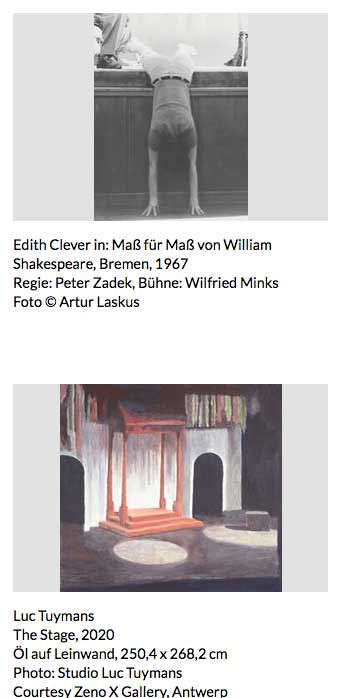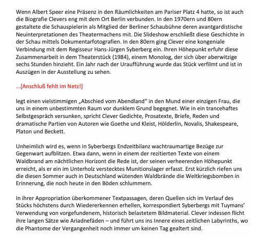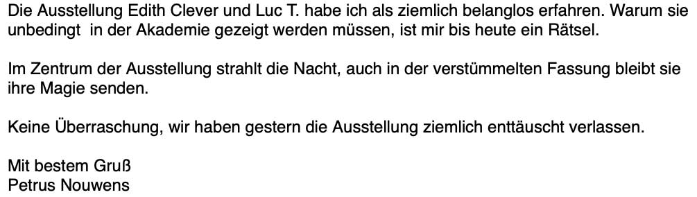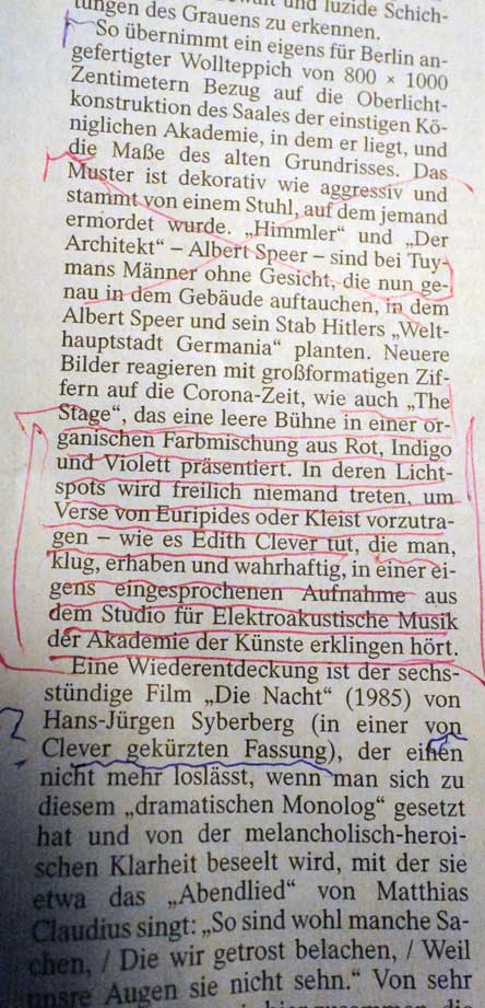 Wir hören von 13-15 Besuchern. Und Tönen durchgehend schon von Anfang an die in der FAZ bechrieben werden, als käme Kleist und Euripides durch das Bild the stage in den Raum der Möder vom L. Tuymans mit der Stimmme von EC, vielleicht das Entrebillett hier zu sein, in der Akademie am Brandburger Tor, das sie nun mit Farben bespritzt haben, bunt, die sich letzte letzte Generaton nennen.