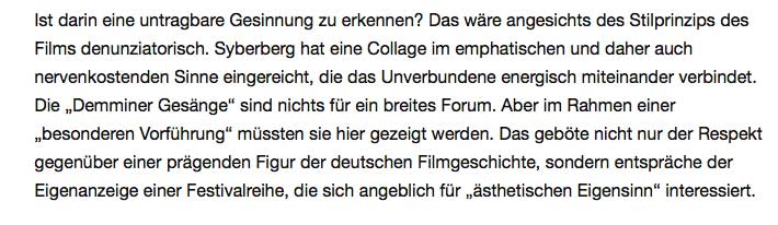 Und das ist ein Kosmos nicht eines Films, den man abwehrte oder unerlaubte Bilanz eines honorigen Alterns.