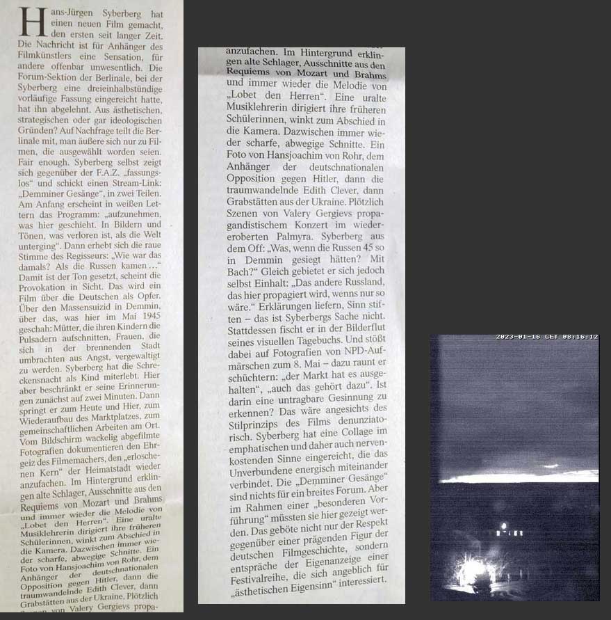 Und das Zeigen geschieht mit einfachen Mitteln an Technik und Geldern, auch der Bürger, und in der Konzeption den Versuch eines Erwachens - als monologischer Film in Gesängen . Wie sie dort noch entstehen.