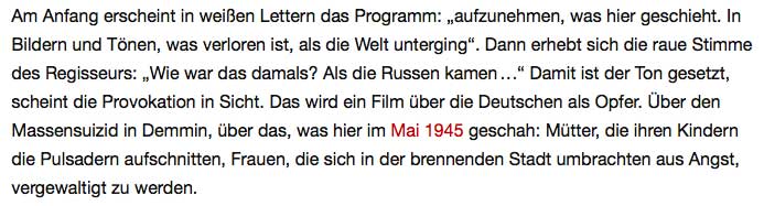 Die Leitung der Festpiele besteht nun nicht mehr und vieles andere liegt im Argen, was der Film beschreibt am abseitigen Ort in Demmin 78 Jahre nach dem Ende des letzten Krieges . Die Begründung der Ablehnung war er sei zu deutsch .