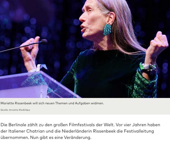 Berlinale. Was ist da los. Doch alles richtig gemacht. Die meisten deutschen Filme aller Zeiten im Programm. Aus Hollywood der Grösste erhielt den goldenen Bären für sein Lebenswerk. Das Publikum kam und und in allen Programmen jüdische Filme als Themen oder Gestalter, die Ukraine wurde geehrt, eine Frau in der Leitung und als Jury-Vorsitzende, der goldene Bär des Jahre als humane Leistung der Geschichte gepriesen. Jubel in den Sendungen des Fernsehens. Und nun nach diesem Abschied der Spitze beschämt, wer dabei war. Und Glück für alle, die da nicht betroffen sind. Von diesem Fiasko, Misstrauensvotum von oben, weil vorher rausgefallen.