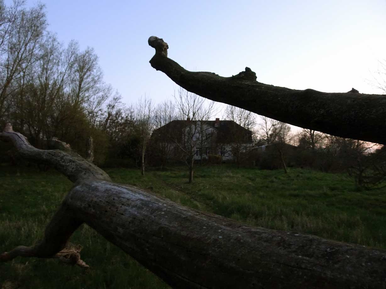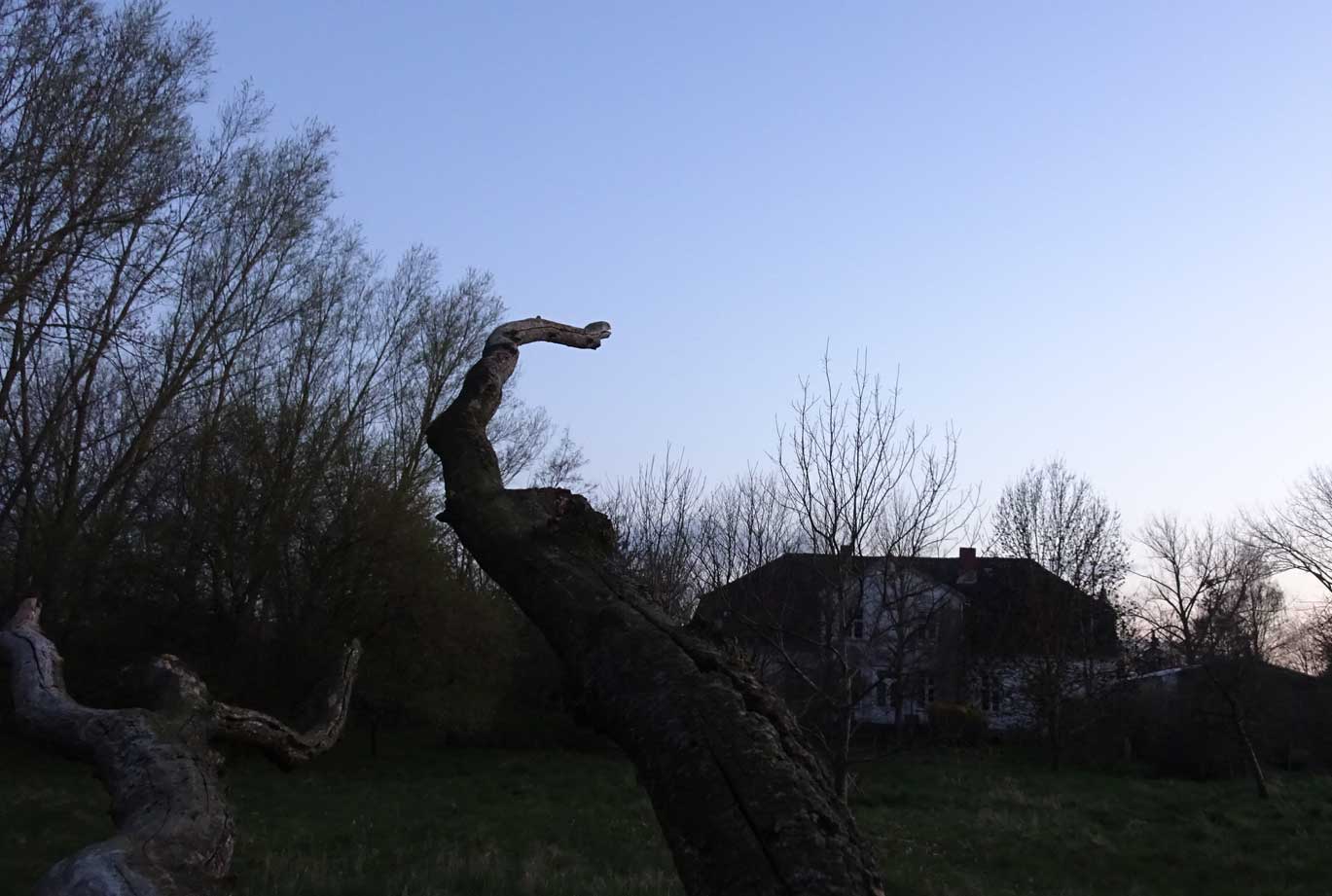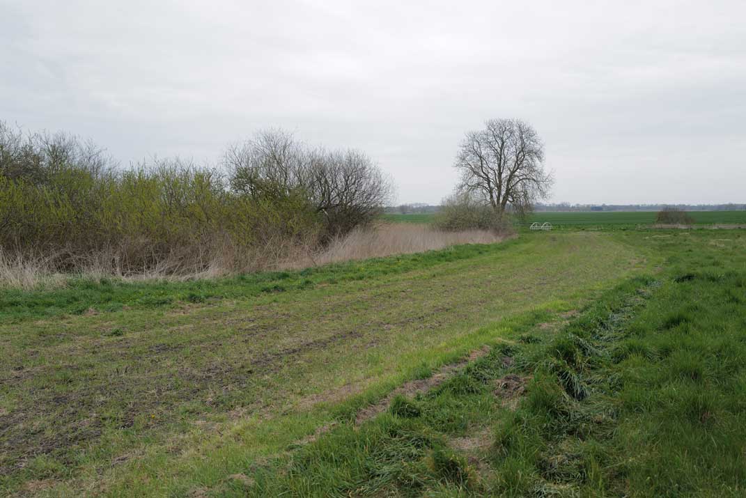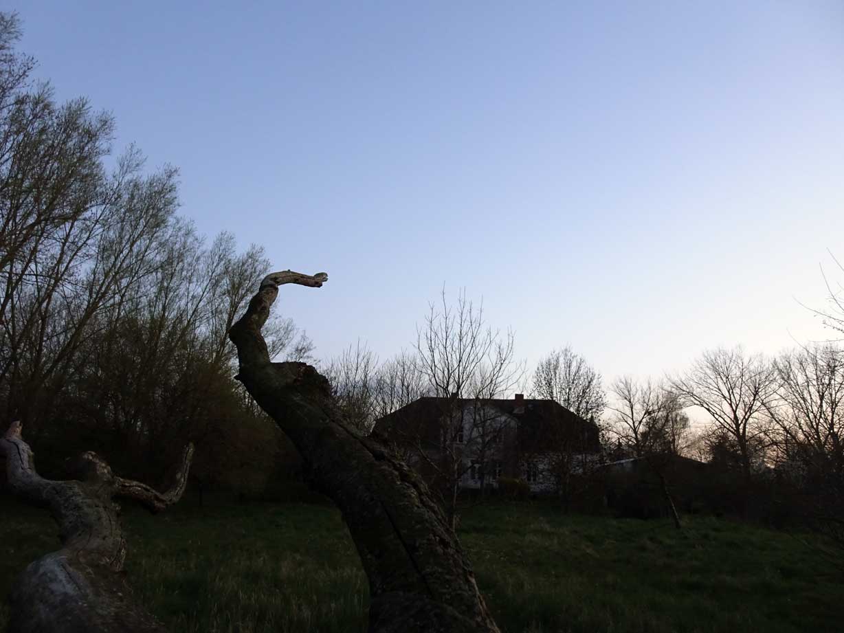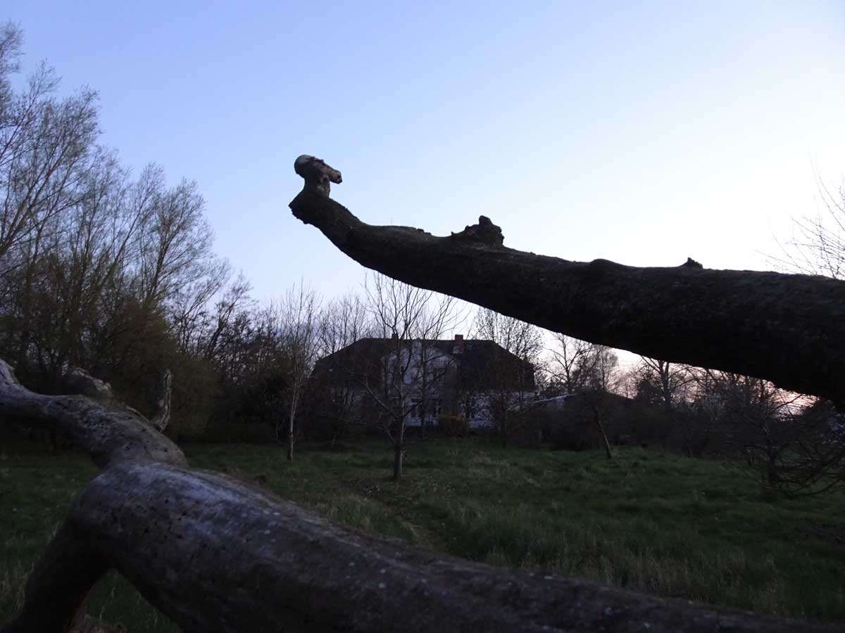Die Ulme am Graben, wo der Graben früher war, vor den Feldern in den Hecken.