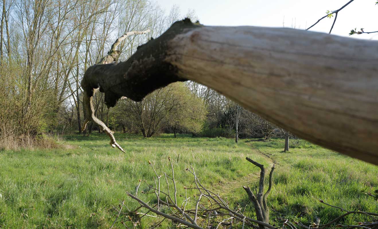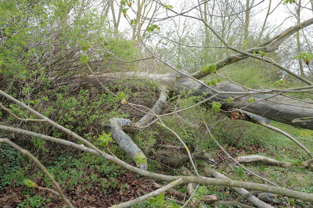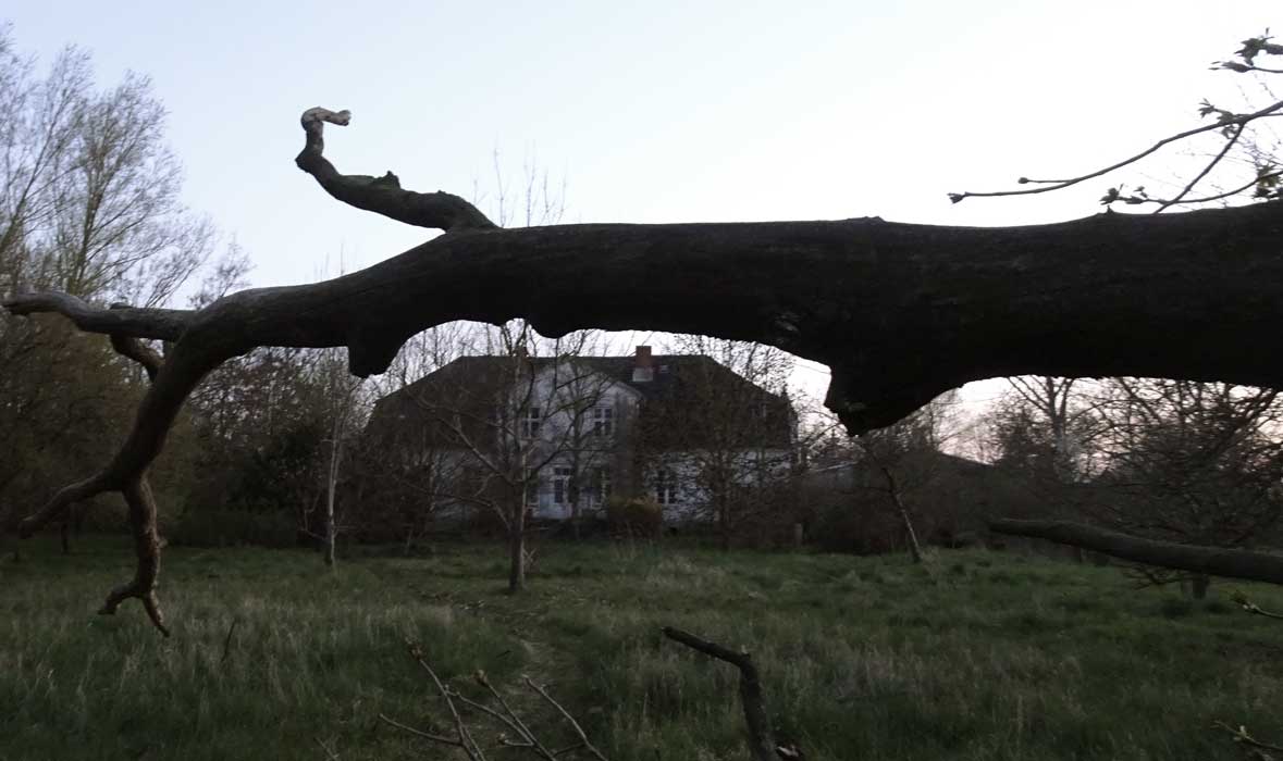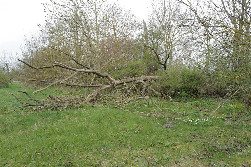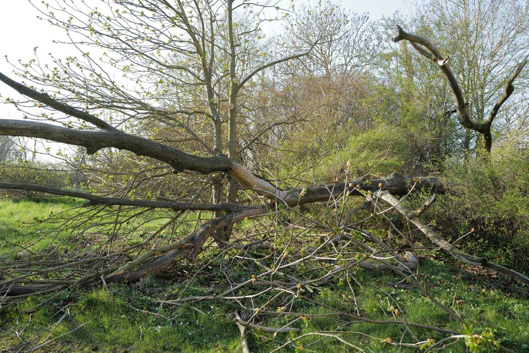 Die Ulme am Graben, wo der Graben früher war, vor den Feldern in den Hecken.