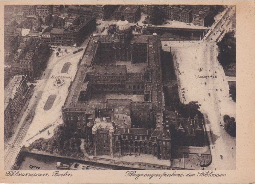 Die Pk zeigt das Berliner Schloss schon als Museum, aber noch ohne die quer führende DDR-Achse heute, die Das Schloss von den Museen trennt (damals hinter dem "Lustgarten").