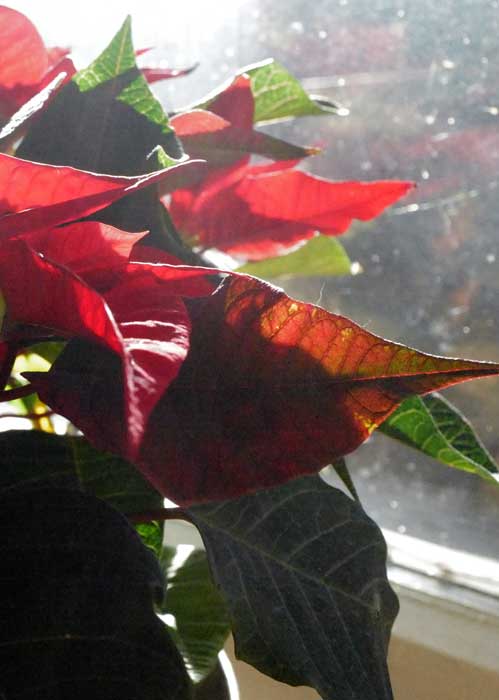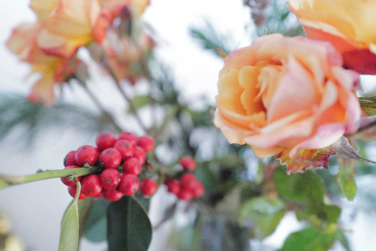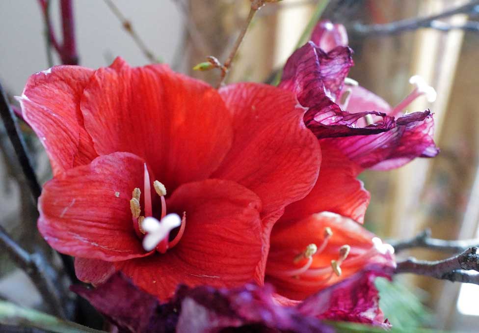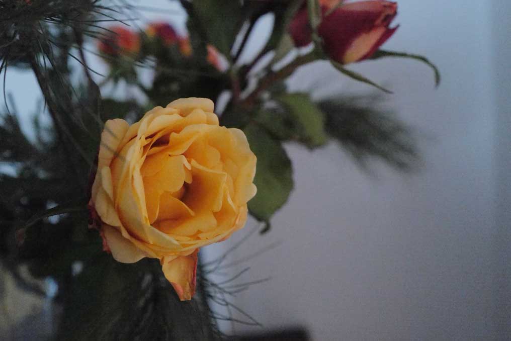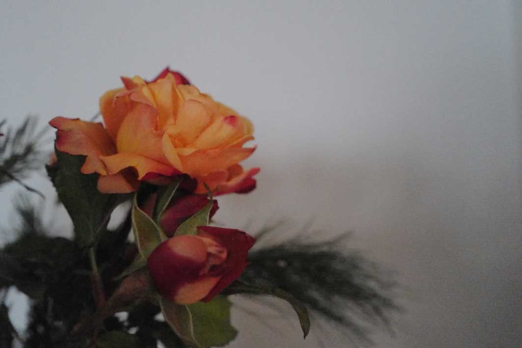 und die letzten Rosen aus dem südlichen Freiland sind geschützt unter heftigem Schnee von draussen in der Nacht