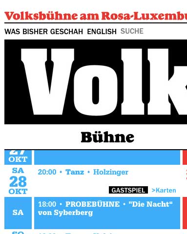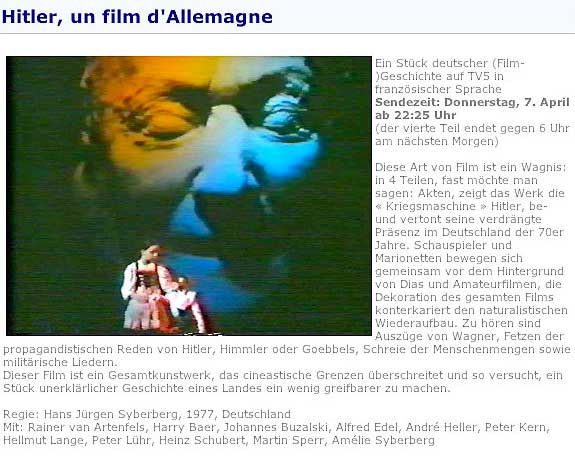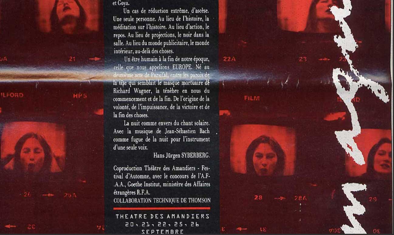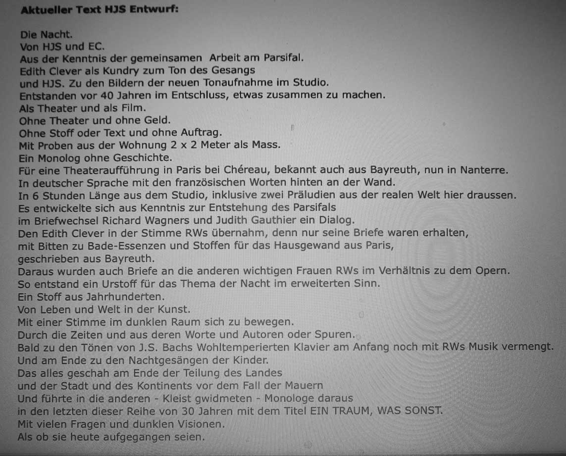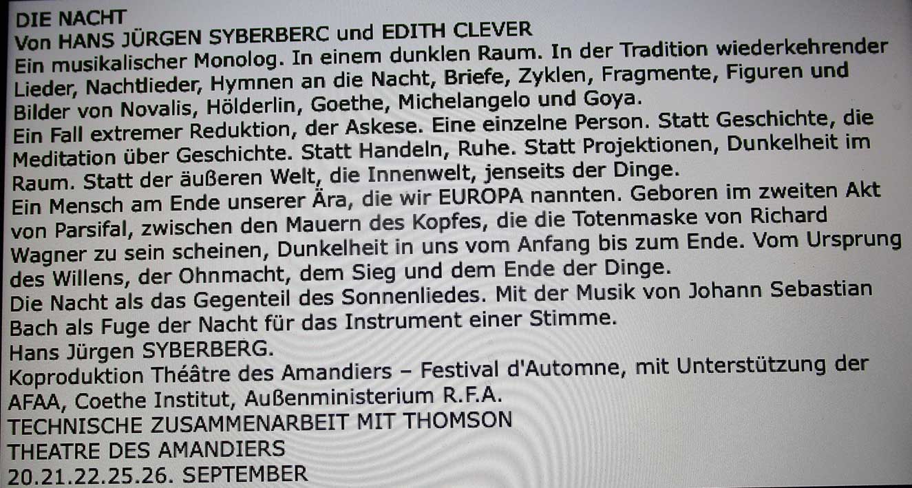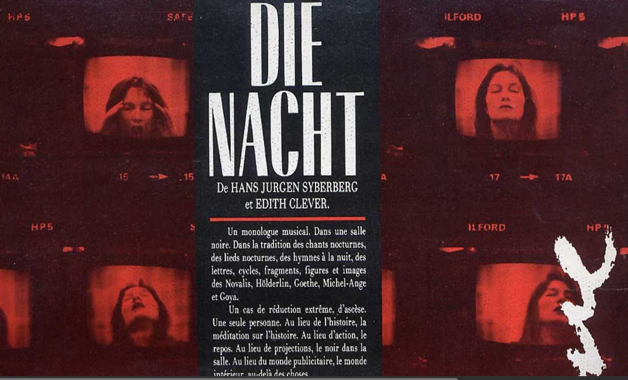 Was in der Volksbühne Berlin für den 28. Oktober auf der Probebühne jetzt als Film angekündigt ist als DIE NACHT von Syberberg zur Unterscheidung der gekürzten Nacht in der Akademie der Künste in Berlin zur Zeit, wurde vor 4o Jahren für Paris entworfen und geprobt als Uraufführung des Festival d' Automne in Nanterre bei P. Chereau. Ein Monolg von 5- 6 Stunden Länge in deutscher Sprache mit Edith Clever.