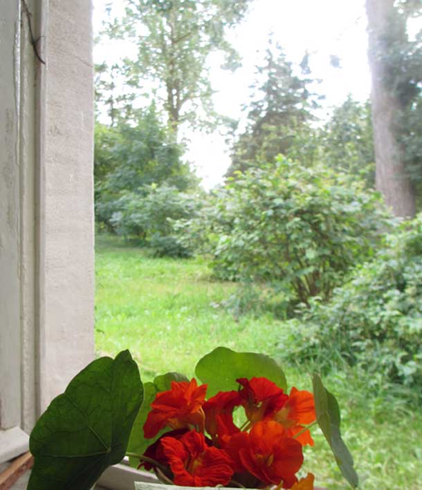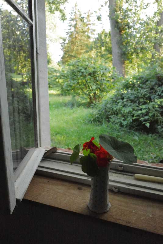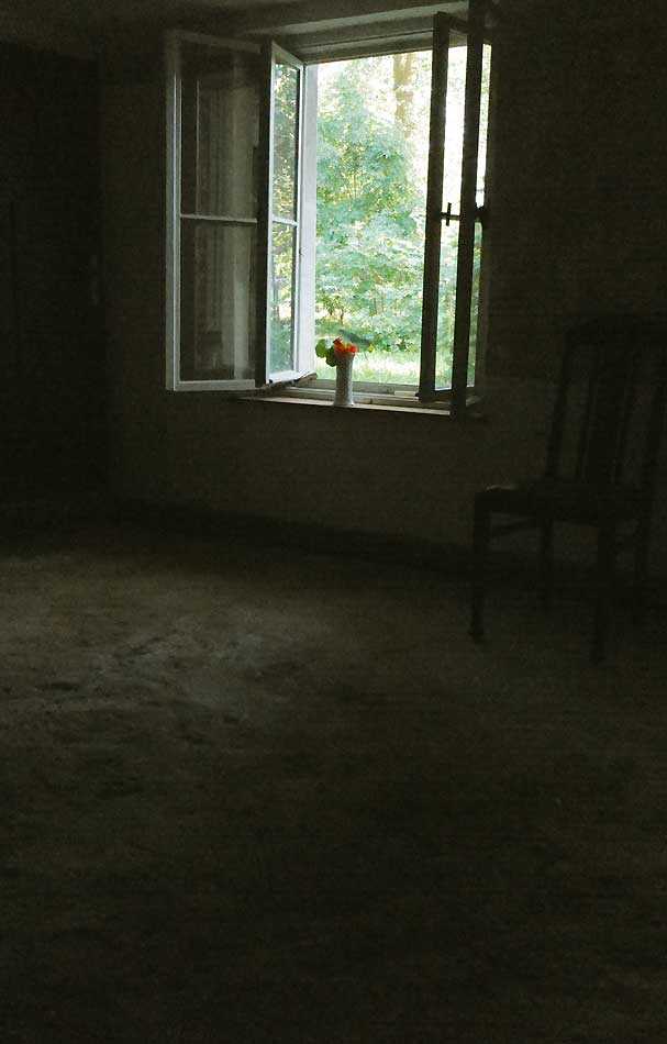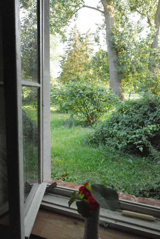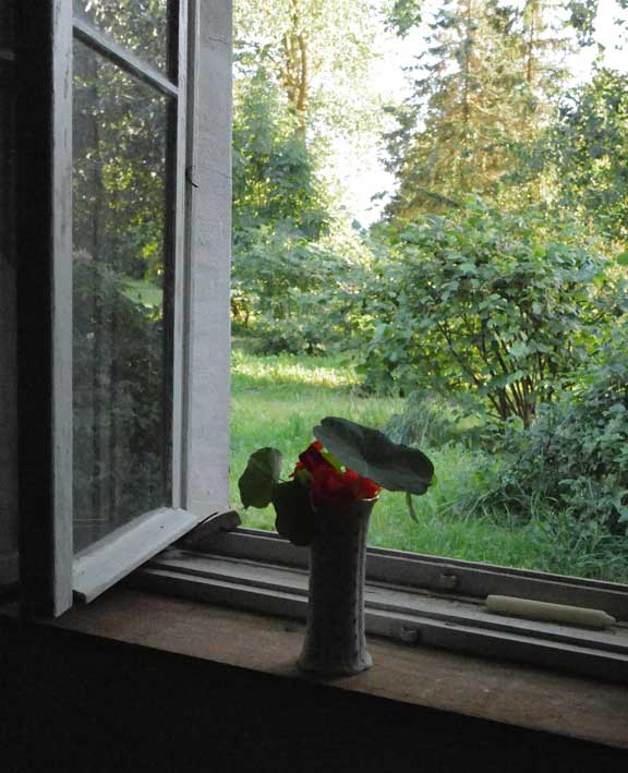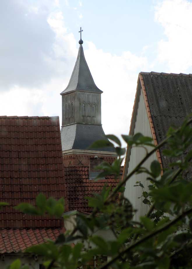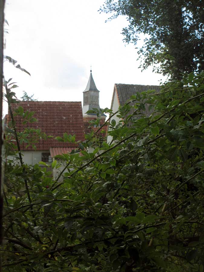 Zwischen den Dächern, doch, drängt es sich wieder hoch, der Turm. Aus dem Fenster hier gesehen.