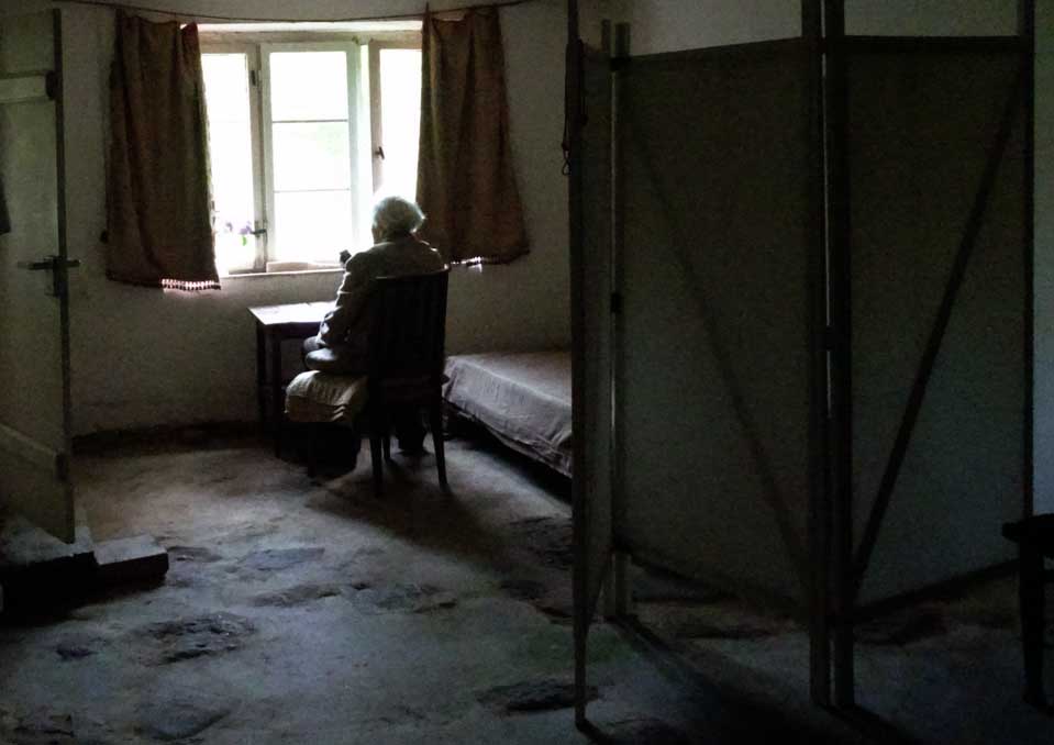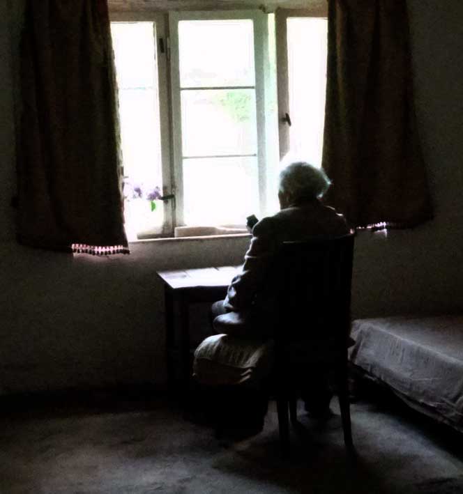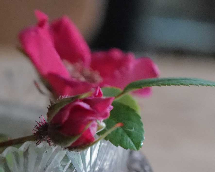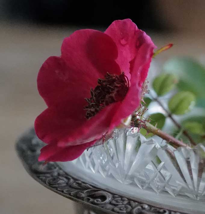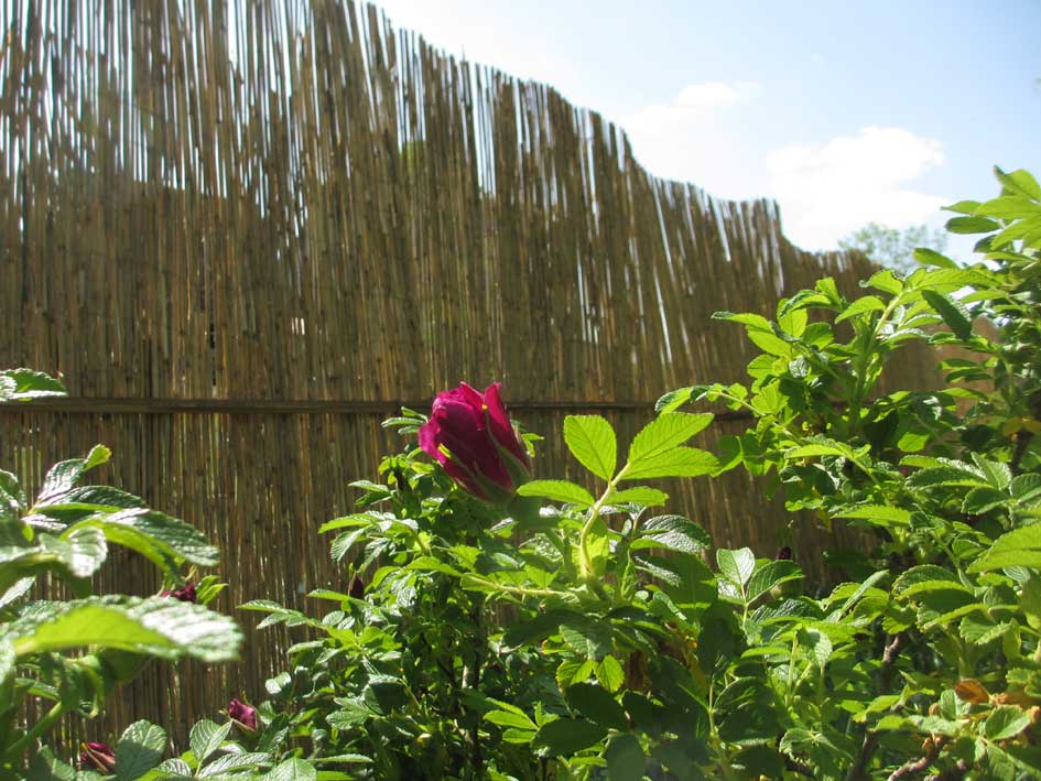freuen und frt nrun aufgegangenen Rose Moseii -wer sich das wohl ausgedacht- vor dem Fenster