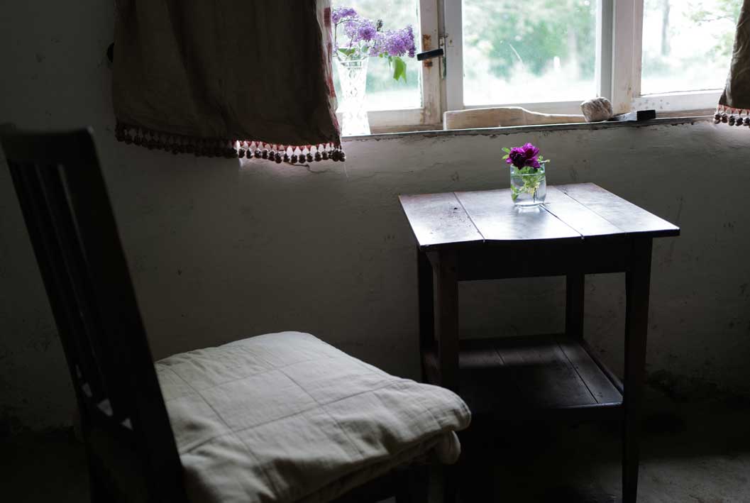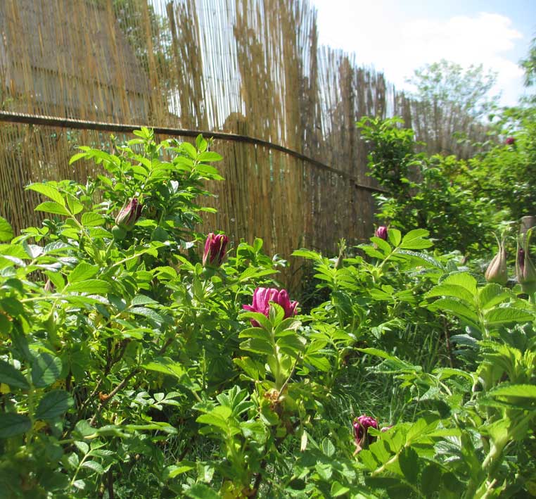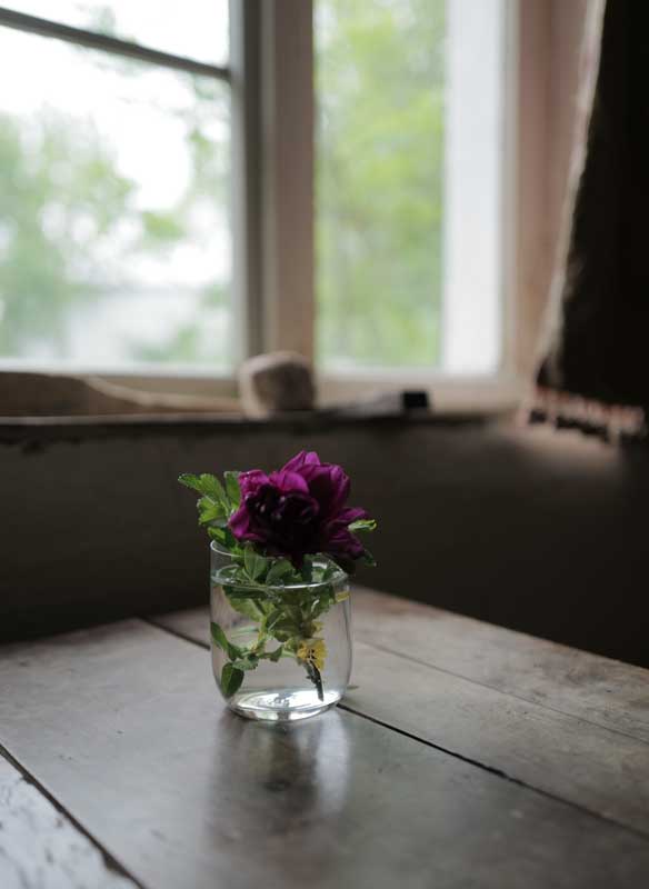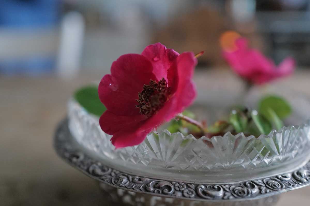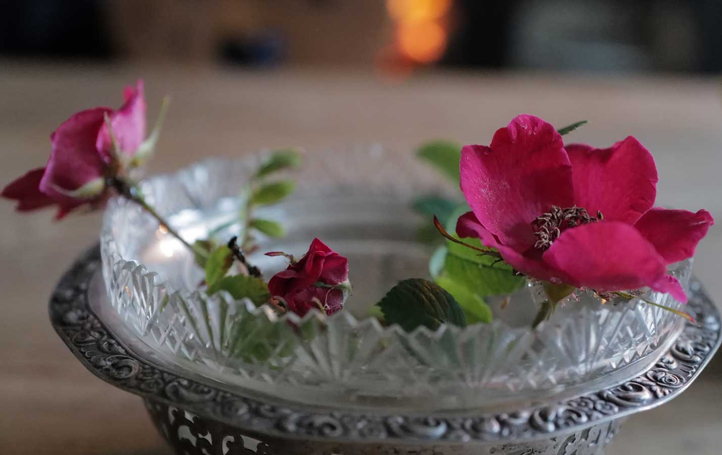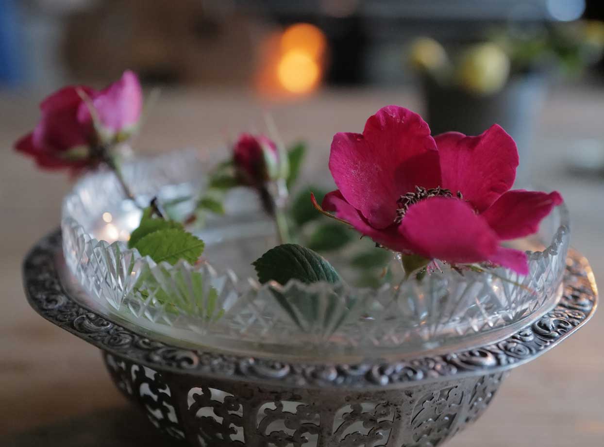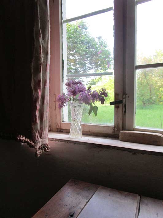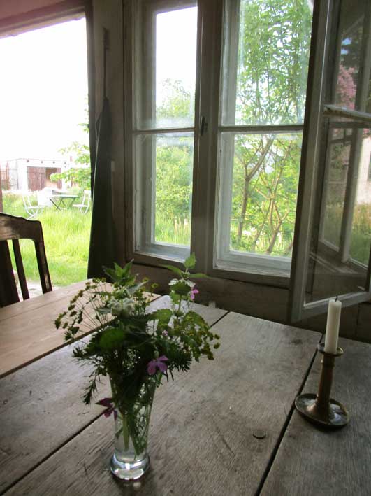 Nun kommen sie zu sammenTisch und Rosen und der Flieder mit dem alten Holz der Platte von über 250 Jahren