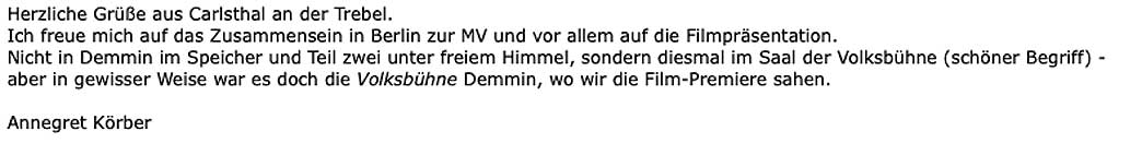 nun kommen auch erste Gäste aus Demmin nach Berlin, wenn wir sie zeigen, dass sie singen. Und vom Fernsehn die, die immer dran geglaubt haben, dass Demmin erwacht - und seis auf diese Weise. Alte Freunde auch sagen zu, aus Ribnitz Damgarten vom Bodden, das wird ein Fest der guten Art. "Movi" das alte Wort für Film heisst bewegen. vitalisieren