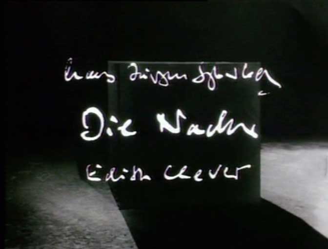 Der Film DIE NACHT entstand auf der Suche nach einem Raum . Zu Arbeiten für ein Theater und einen Film. Paris das Festival du Autumne als Aufführungsziel. Nach dem Parsifal Edith Clever im Zentrum. Und allein. Ein Monolog also und Sprache, Worte als Material. Ein geschriebenes Stück -Grüber und Moreau versuchten das gerade in Paris mit einem Apfel zu schälen am Tisch- war eine andere Option. Wir entwickelten die Frage warum überhaupt Theater und die Urform hier fanden wir im Vorbild Griechenlands. Aus eigener Herkunft und dem Film nahe das Gerüst der Scheune, die es nicht mehr gab, aber als Modell der Bewegungen im Raum zu balanzieren, der fruchtbar wurde.