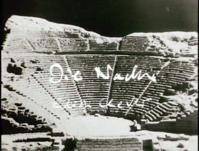 Im Vorspann zum ilm heute sichtbar wird, um die Namen und Umstände der Entstehung zu zeigen, auch in dem was, dann nicht gebaut wurde zum Gebrauch aber den Gedanken half, so sehen wir Delphis Theater, Stein um Stein getreu als Model dafür gebaut, die Scheune in N. als Gerüst nochmal, so auch nachträglich aufgenommen alles, zu blättern im Album der Gedanken, Dinge, die uns dienten vor der Kamera zu sehen oder im Text verborgen.