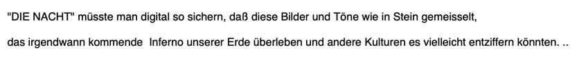 Es war der Versuch von zwei erwiesenen Spezielisten des Theaters und des Films beide Darstellungs-Welten zusammenzufügen . Mit den zugewachsenen Worten und Tönen wie sie einsam und unerlöst zur Verfügung stehen, in Büchern oder Archiven, einen eigenen Formen-Kosmos zu schaffen im Dunkeln des Welt-Alls Kunde zu geben von der Geschichte unserer neuen Menschen-Möglichkeiten auf diese Weise. Auf kleinstem Raum, sich anzuhalten zweimal nach Aussen, wo wir sind, sonst unter uns. Mit diesen Schätzen der Worte und Musik, die aus dem Kern der Dinge eine eigene Heimat suchen lebendig zu werden. Wenn es gelingt. Das aber war erst der Anfang von noch anderen Versuchen solcher Art danach.