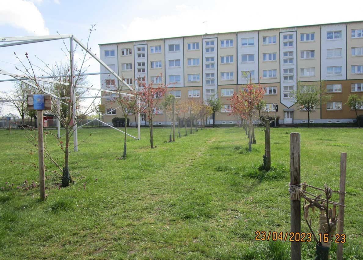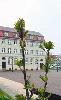 Nochmal der Kellergang zum Rathaus und seine 24 Bäume. Davon der Rechte am Rathauseingang der kleinen Allee wieder im letzten Jahr verletzt mit Beschädigungen bis hinab zur Wurzel.