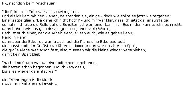 Noch gestern gesprochen von der Vielgestalt der Texte und Zuschriften, gerade diesen erwähnend, und dann nicht dabei. Das konnte ergänzt nun werden. Er hilfreich mit den Händen und sie mit der Musik so von innen. Zur Form gewoden alles als Tat.