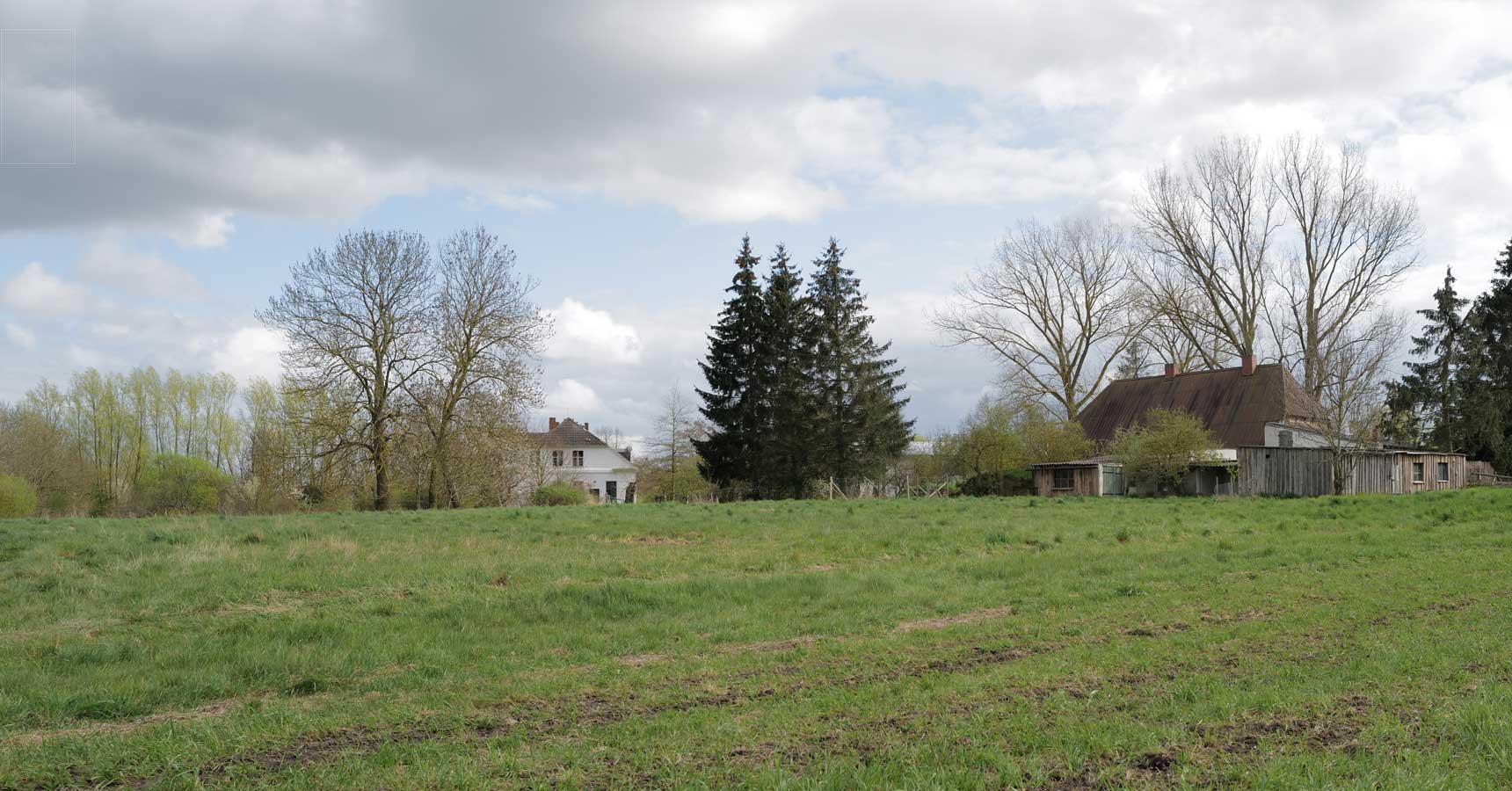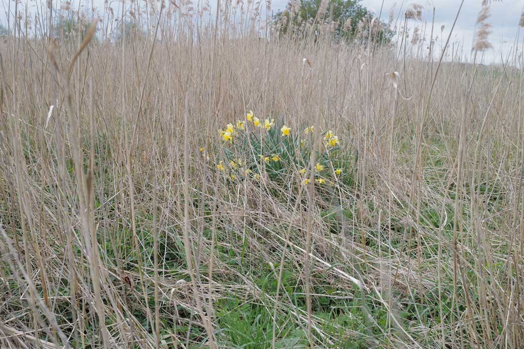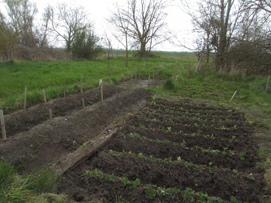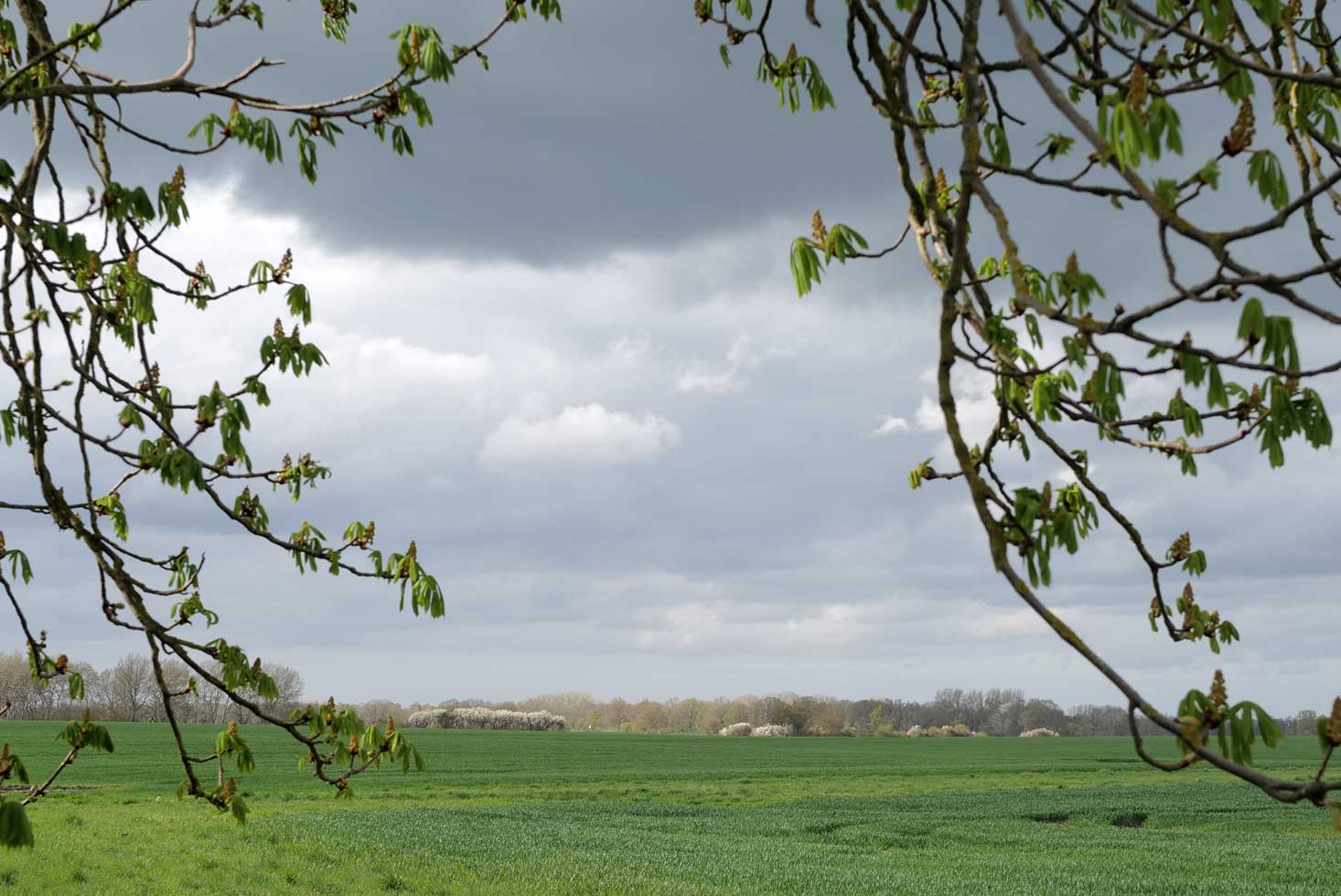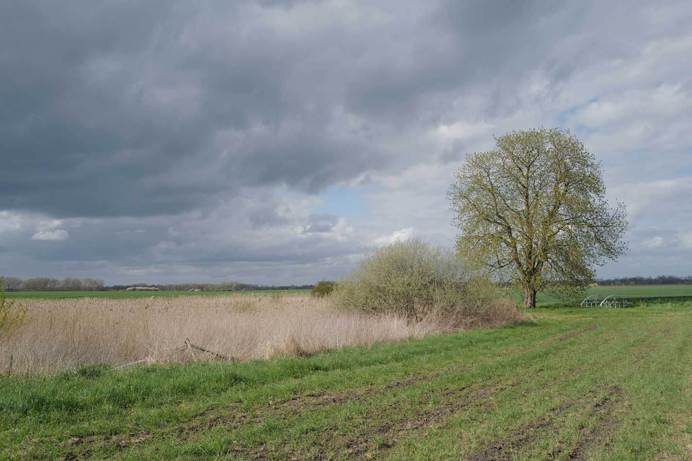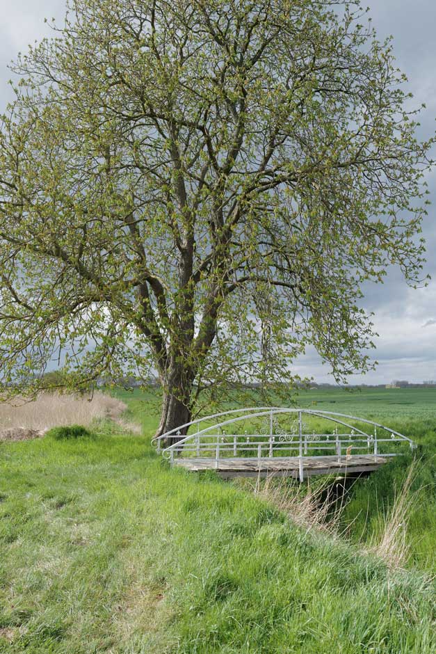 Noch sehen wir der trangendes Äste dunkles Gerüst im aufgehenden Knospen Netz an der Brücke über den Graben ins Land.