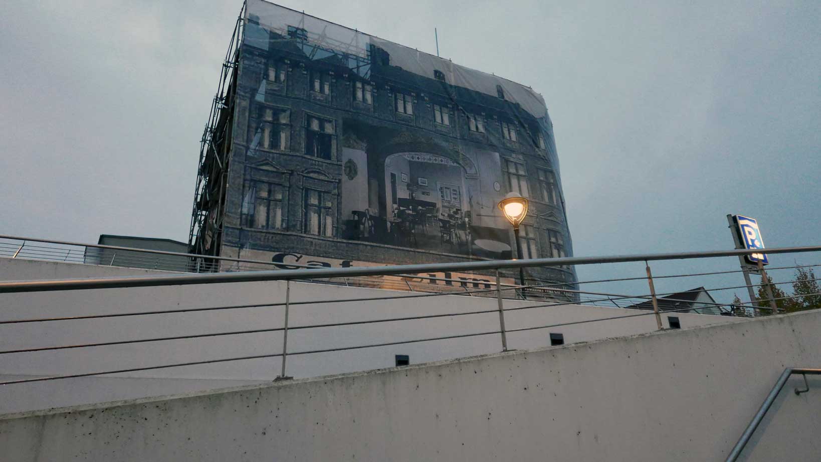 Die Fahne von Fritz Lang zum Film Frau im Mond am Giebel zeigte an was hier vor 90 Jahren zur Geschichte gehörte wenn man nachdenkt als Mentekel