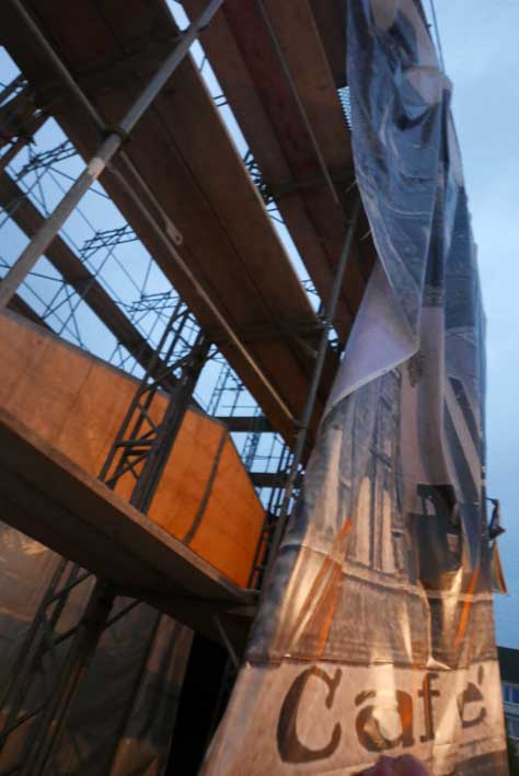 Der Fassaden entblösst wieder, im Musik-Zelt der Stadt, innen gereinigt, spielten wir weiter Tags das Cafe und abends die Filme der Welt-Untergange auch