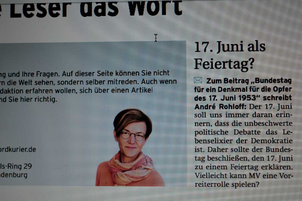 Was die Leser des Nordkuier Demminer Zeitung an die Redaktion schrieben zum 17. Juni in Demmin, darüber kein Wort. Abbestellt.