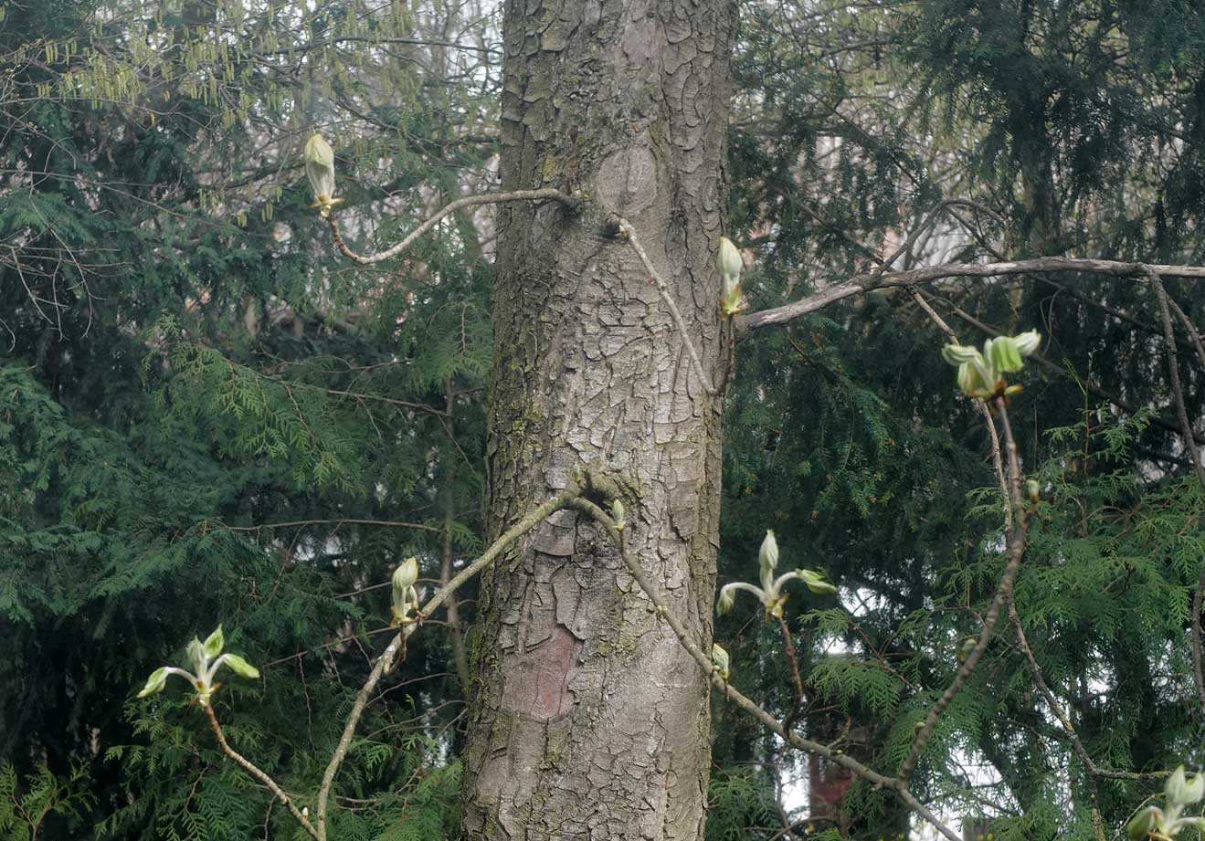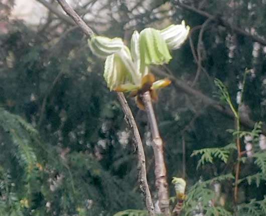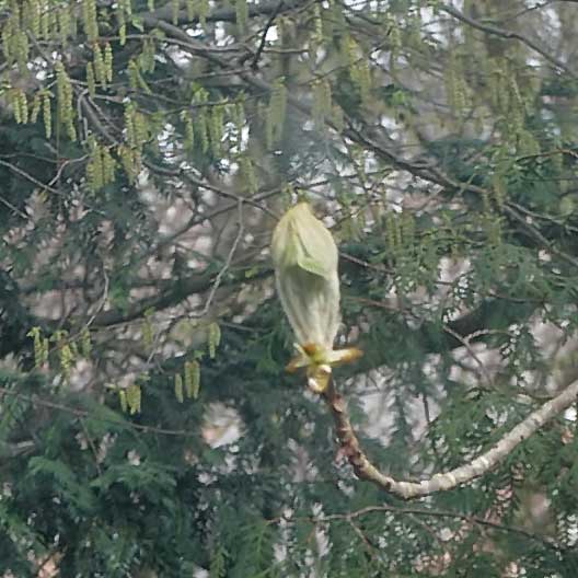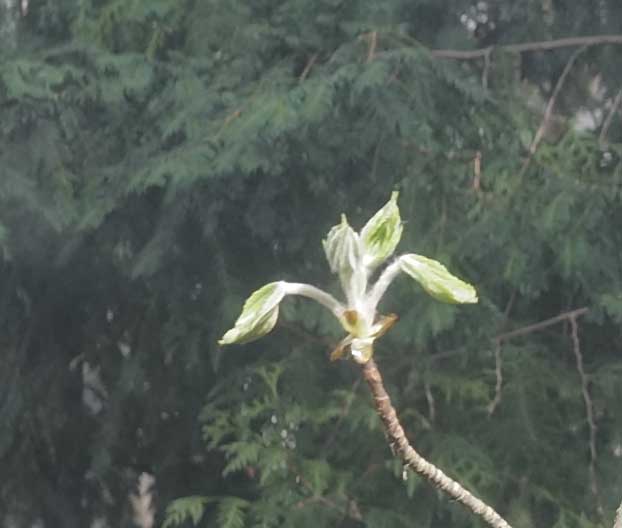 Der morgendliche Blick aus dem Fenster hier zeigt die Knospen der Kastanie schon aufgegangen in verschiedenen Gestalten.