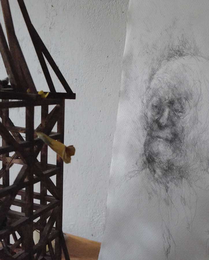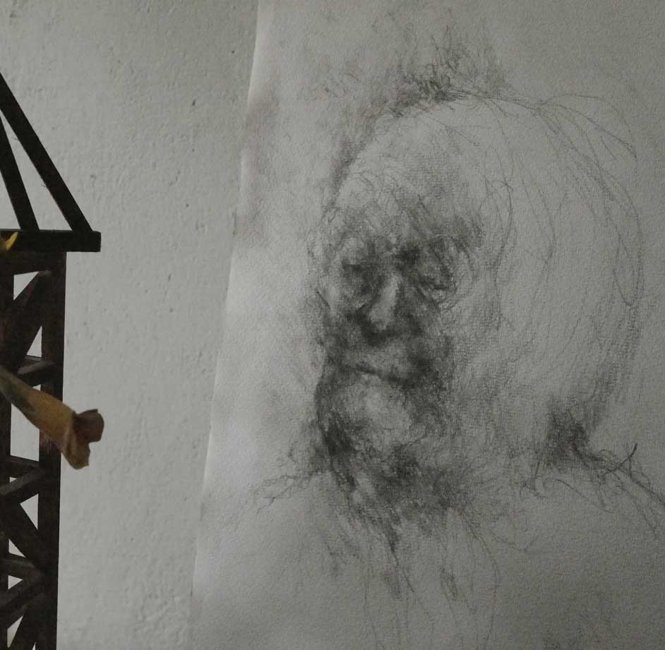 Und der alte Mann von MK aus Heidelberg als Frau, mit loderndem Haarund auch nachdenklichem Blick. Einer der Alten. Die sie zeichnete nach dem Schlaganfall, rechts gelähmt, nun mit links. Die nie Linkshändlerin war.