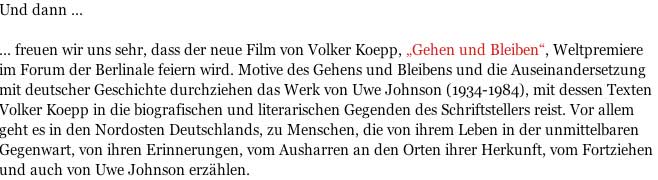 Interessant die besondere Betonung der historischen Motive im Zusammenhang mit deutscher Geschichte dort zur besonderen Kennzeichnung des Films, die uns als Grund der Ausschliessung von der Berlinale hier mitgeteilt wurde . Unser Aufritt dort ist der Anfang des hier jetzt ausgeschlossenen Films aus Demmin.