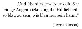 Wer da kam, wurde belohnt mit schöner Ruhe des Landes und der Menschen, die da auftreten und reden von U. Johnson, dem Helden aus Pommern und Mecklenburg, der dies zu seiner Welt gemacht, das uns hier nahe kommt in denen, die da aufscheinen.