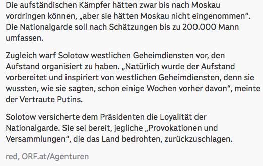 Und wenn das alles erfunden wäre, von wem auch immer, negagiver Elemente, wärs doch von erstaunlicher Erfindungsenergie. Hollywood müsste neidig werden. Coppola war schon nahe dran. Putin besiegt auch zum Raketen-Rüpel der Infamie gezielter Tötungen von Zivilisten und Rache gegen Häuser degradiert .