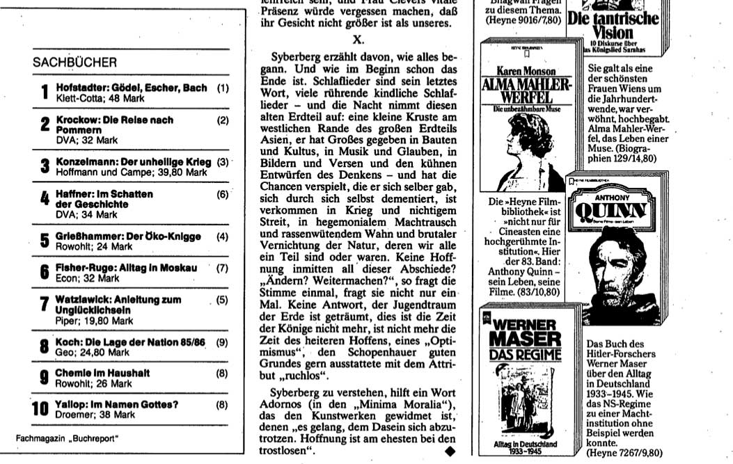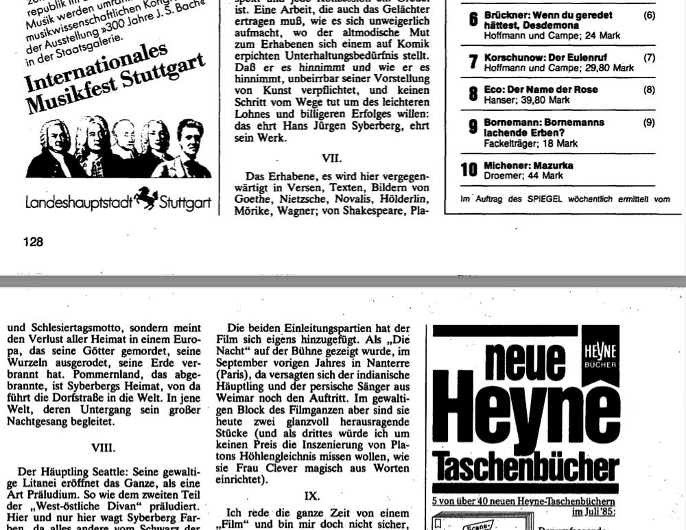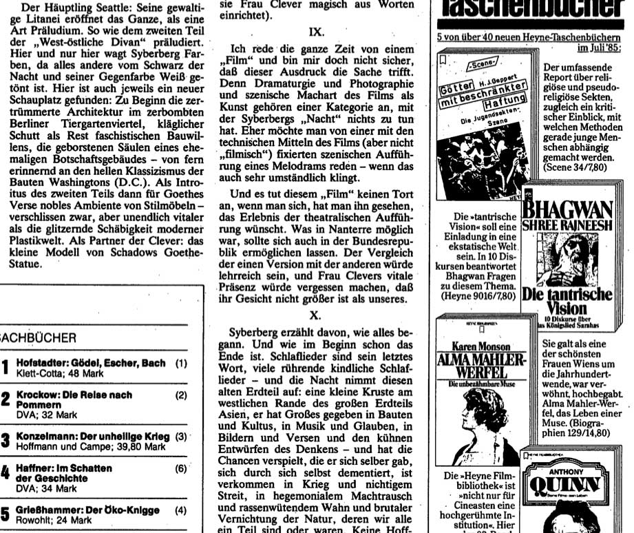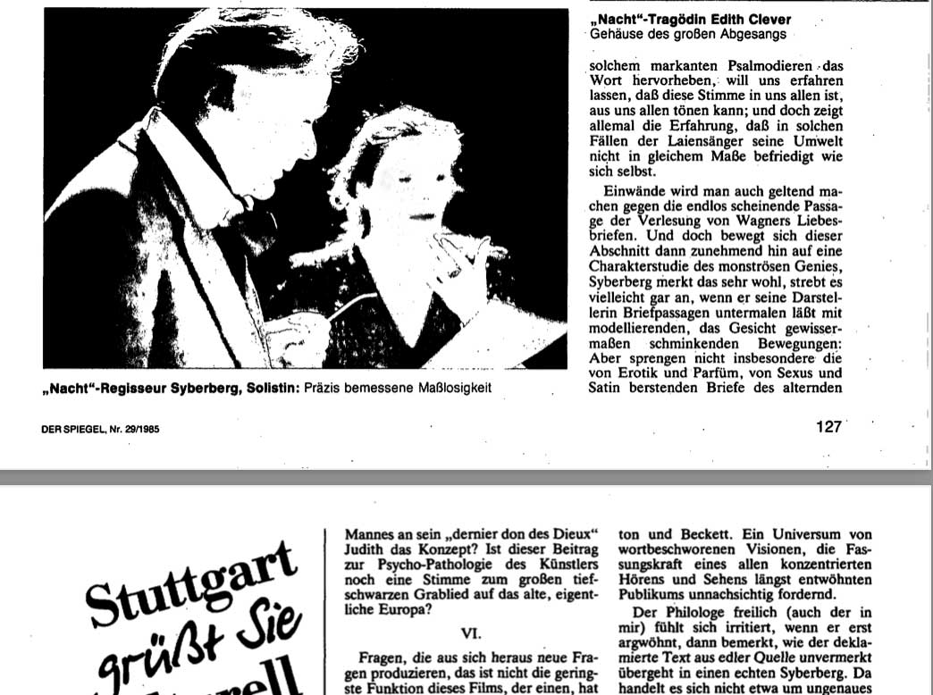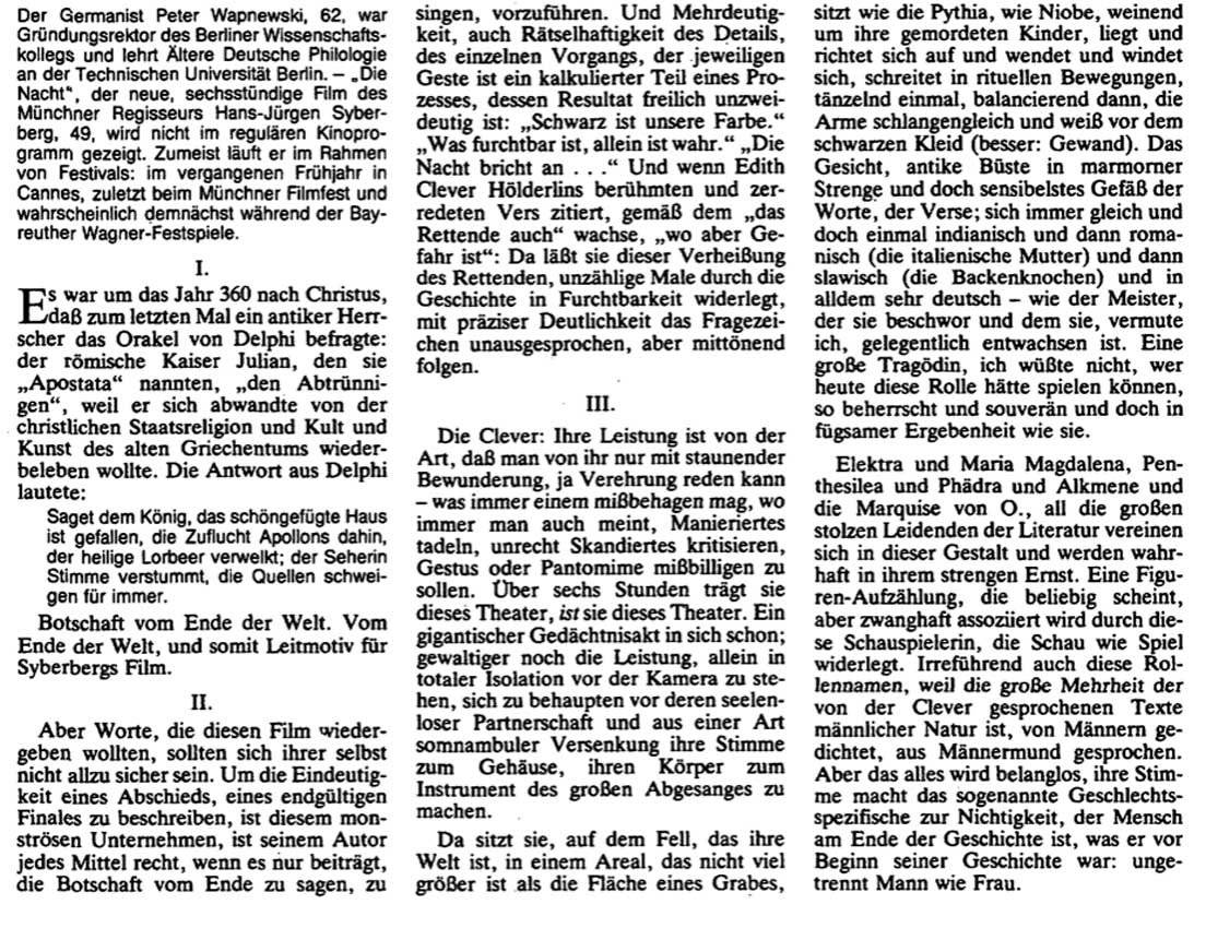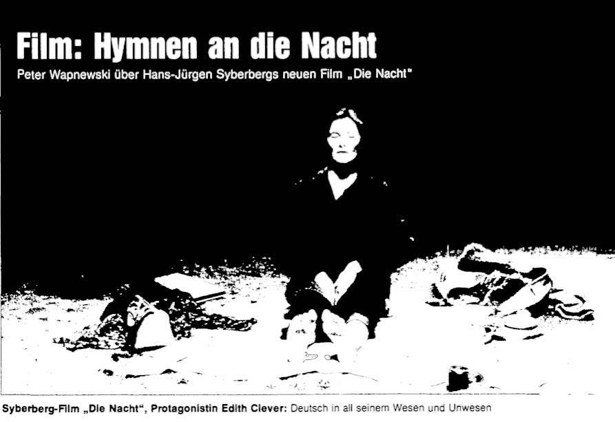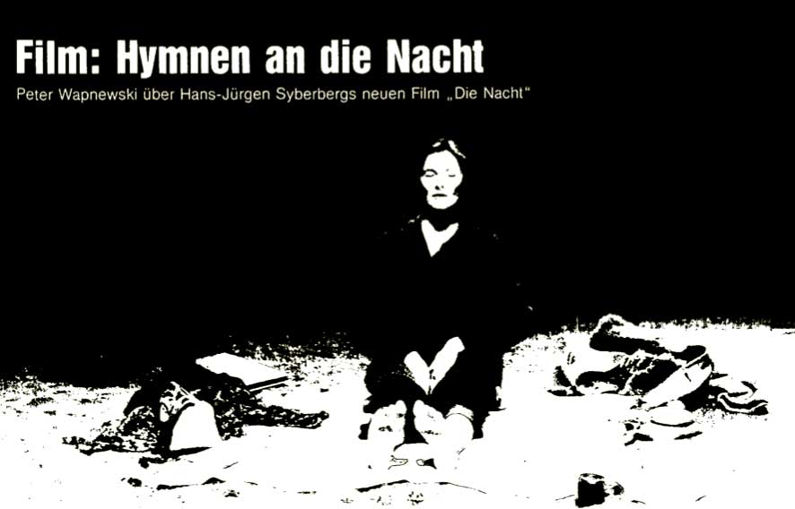 Was vor 40 Jahren entstand und 5 Jahre damals nach dem Hitler aus Deutschland als Film im SPIEGEL von Wapnewski zur Antwort wurde auf Susan Sontags Text aus New York, machte frei sich von ruchloser Zeit diese NACHT abzutrotzen.