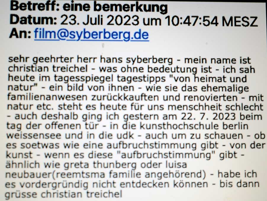 M.Walser gestorben. Frauengeschichten, neben viel Lärm um den nicht erreichten Nobelpreis, von den aktuellen Bildern jetzt am liebsten das alte Gesicht im Schilf am Bodensee. Damals in Bayreuh M. W. neben Augstein und Dohnanyi oben am Waldrand in der Pause zu Chereaus Ring, die Enttäuschung aller drei. So nicht, Wagner entzündet Erwartungen, schwer zu erfüllen. Wir, mit dem Parsifal im Gepäck für das Kino nun in Bayreuth zu dem Wolfgang Wagner nicht kam ("das könnte Ihnen so passen") D. half vergeblich DIE NACHT dann im Entstehen, statt Bayreuth - Regie, nach Deutschland zu holen, ans Theater. So kam sie nach Paris, auch nicht schlecht und nie nach Deutschland je und wo auch immer. Nun als Film, auch nicht schlecht, an die Akademie in Berlin, demnächst in Teilen - Fragmente. Das wird noch was.