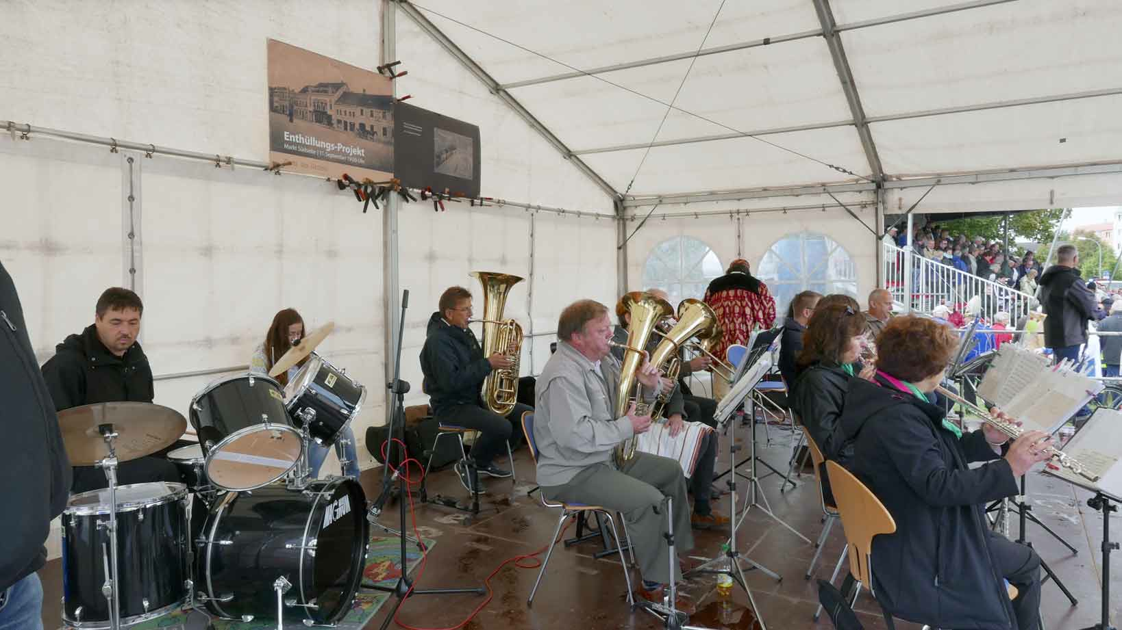 Unser Ausflug nach Demmin entstand mit der Idee aus diesem Musik-Zelt -aus dem dann Cafe Zilm auch wuchs- den Markt nochmal zu finden. Die Fotos an der Rückwand zeigten den esten Schritt zu den Fassaden an der Südseite, die nun fehlten seit 1945. Das war zur 885 Jahr-Feier 2015. Morgen mehr dazu. Was man aus so einem D. machen kann.