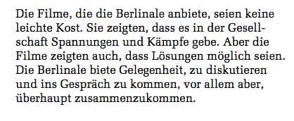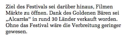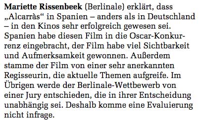 Da sind nun einige Auskünfte der Berlinale-Leitung nicht korrekt, um es freundlich zu sagen. Die Berufung des Festpielleiters auf die Jury widerspricht der eigenen und persönlich Bemerkung "aus künstlrischen Perspektive sei der Film anders" als die früheren Filme, und es sei nicht darum gegangen " das Thema des Films abzulehnen".